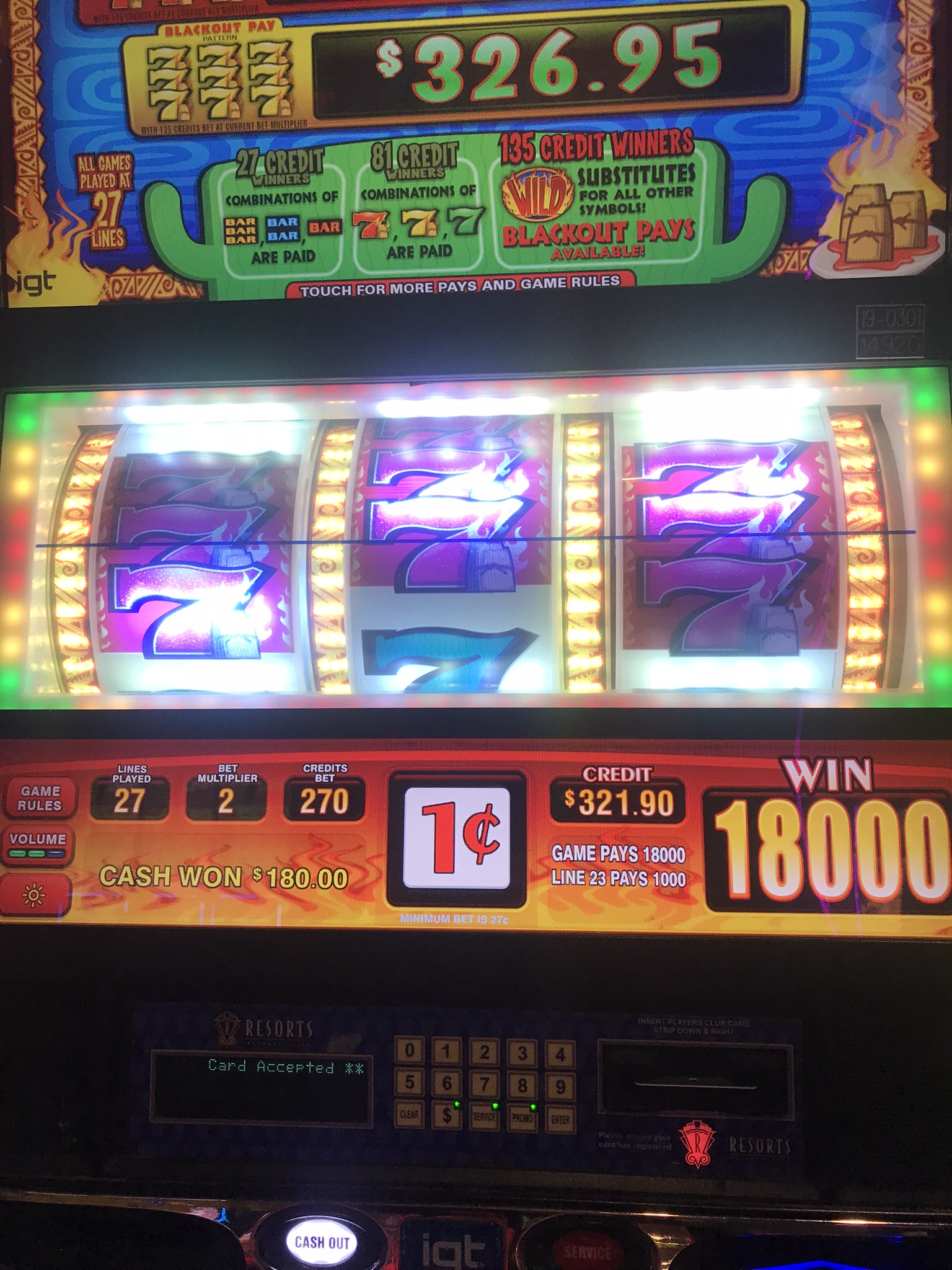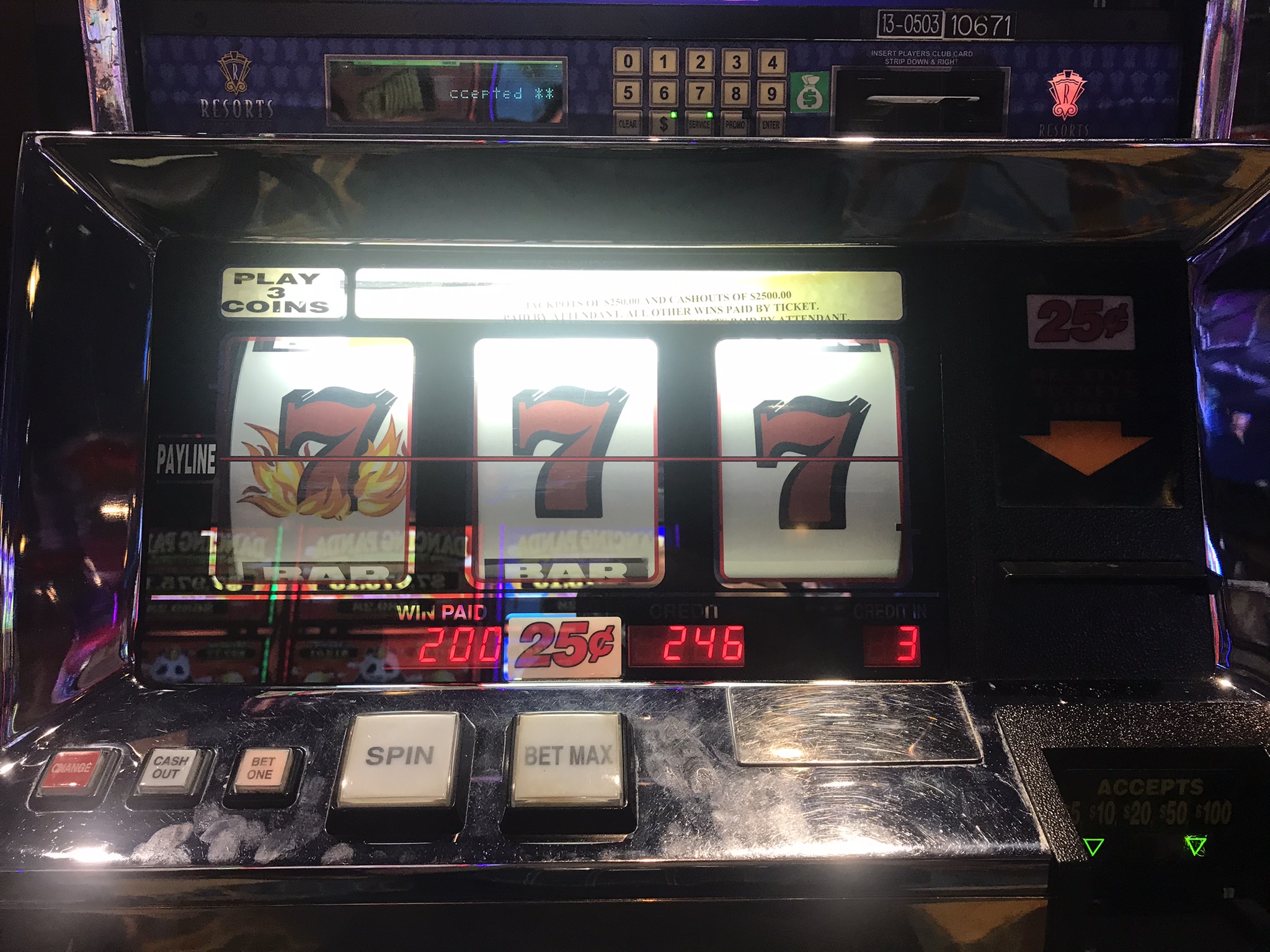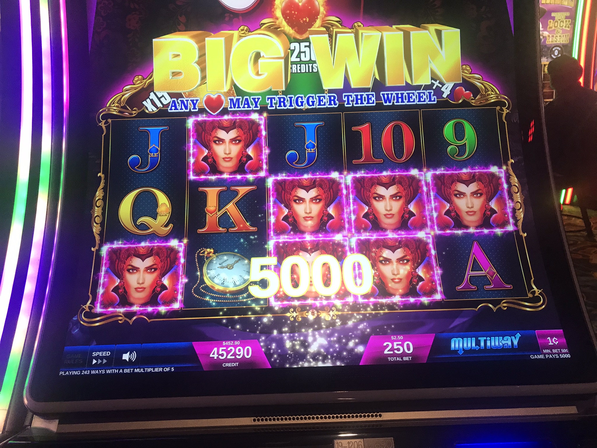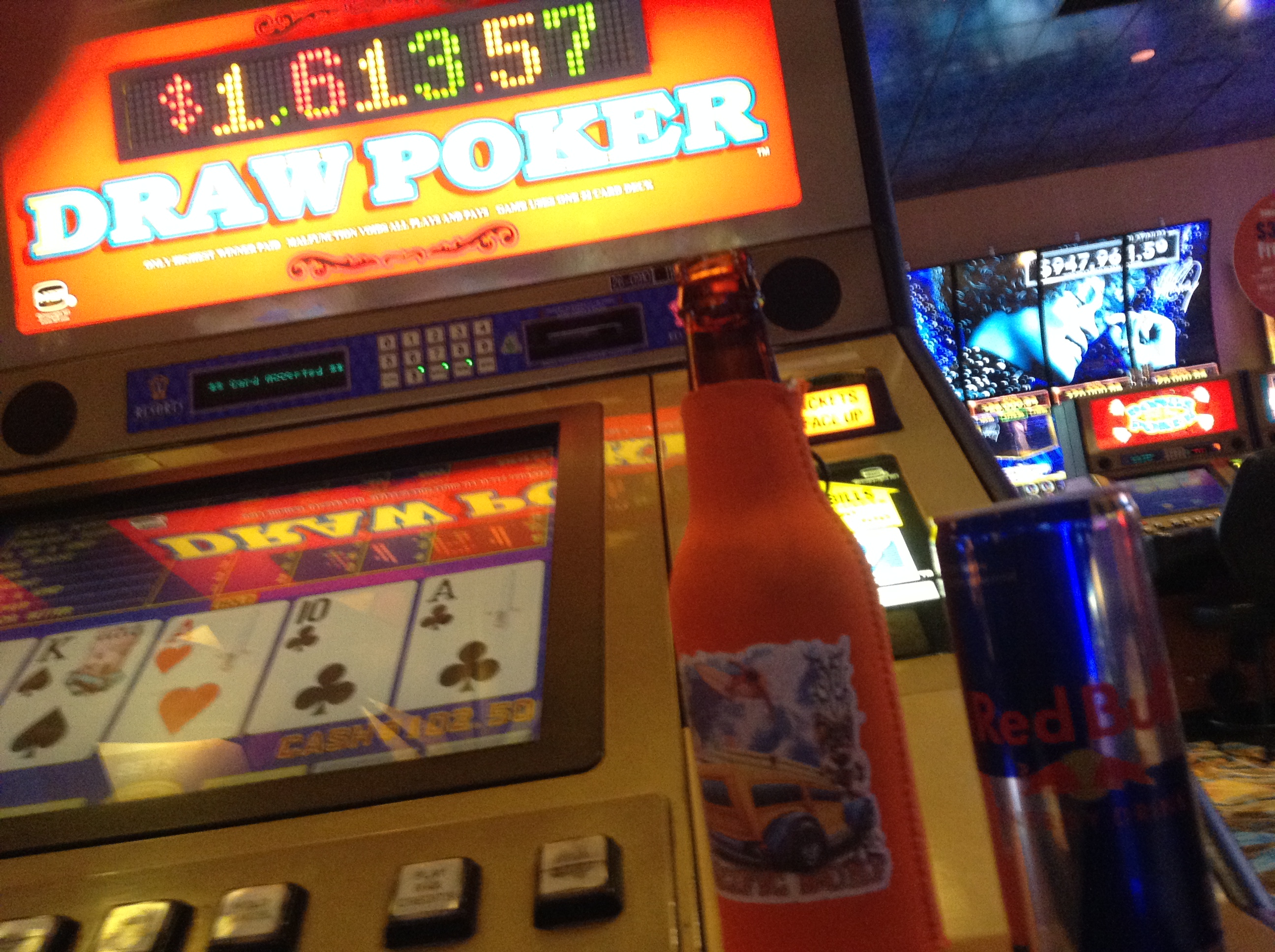 After that quad I just stopped taking pictures of them. I took a break for some lunch at the club and went straight back to work. By my bookkeeping I hit 21 quads. 3 were deltas. Then around 6 p.m. I am joined by another player. She calls over a slot attendant and asked them to lock out one of these 3 progressive machines to reserve it for her brother. He must be a high roller here because in short order it's reserved. She takes the other one. We chatted as we played. After a bit her brother stopped by but never sat down. She finally gave up on him and had the machine unlocked. She sat down and started playing on that machine. She hit it. $1672. Just like that. Oh well, I was about done chasing that darn thing anyway. Good for her.