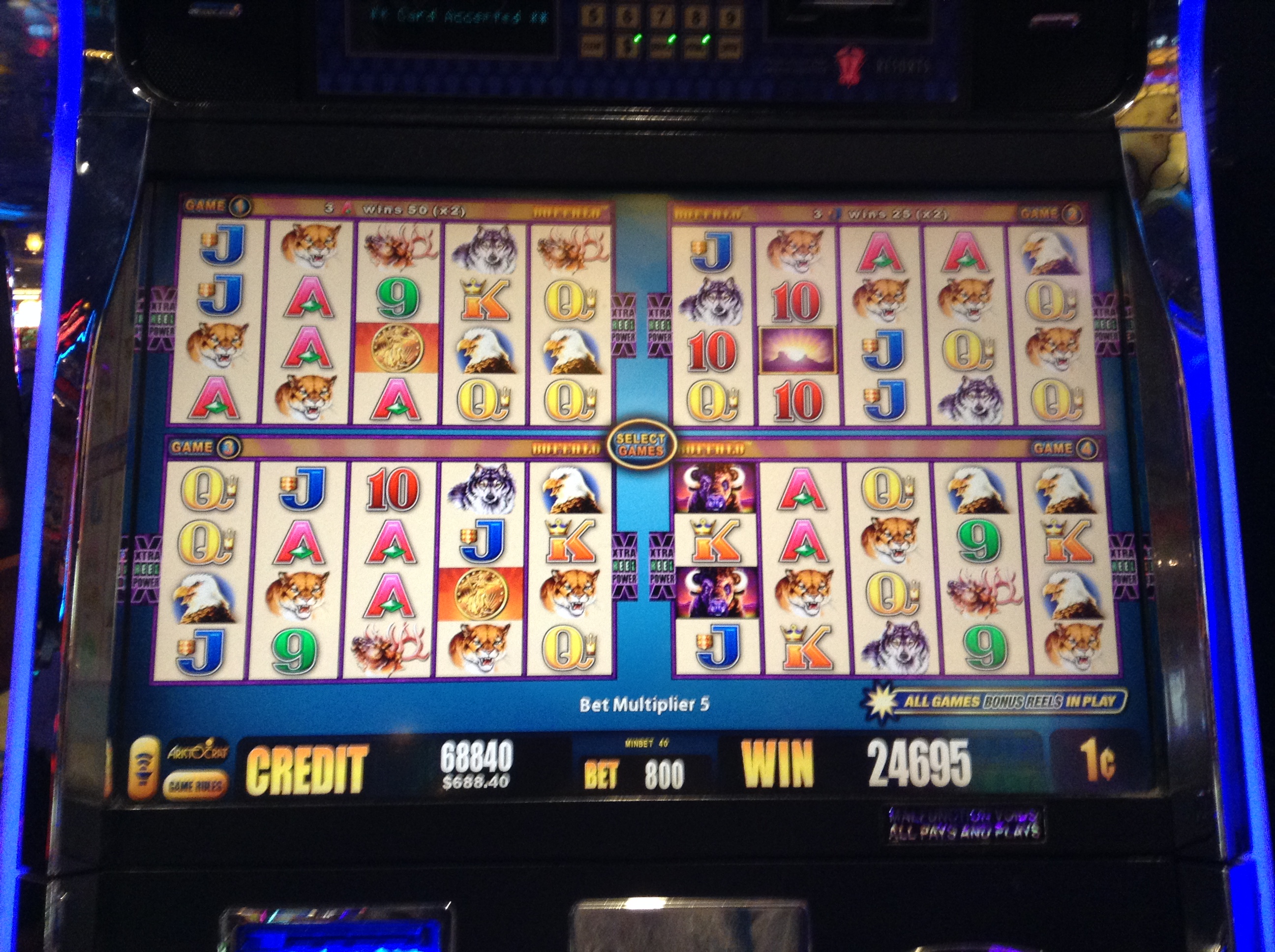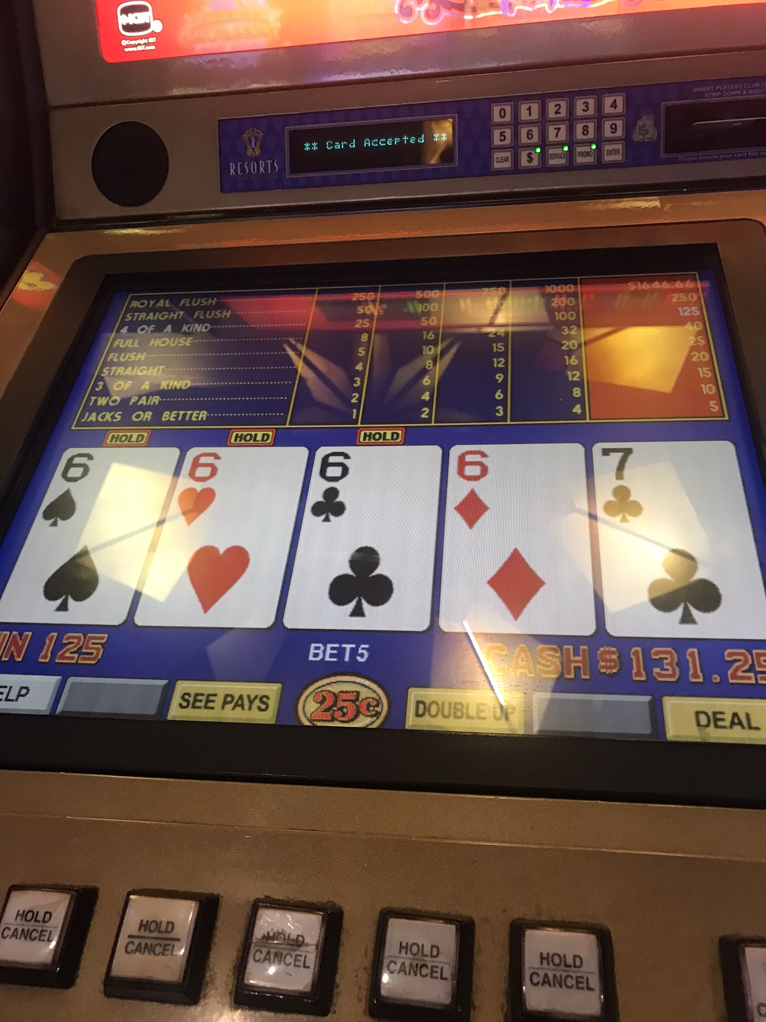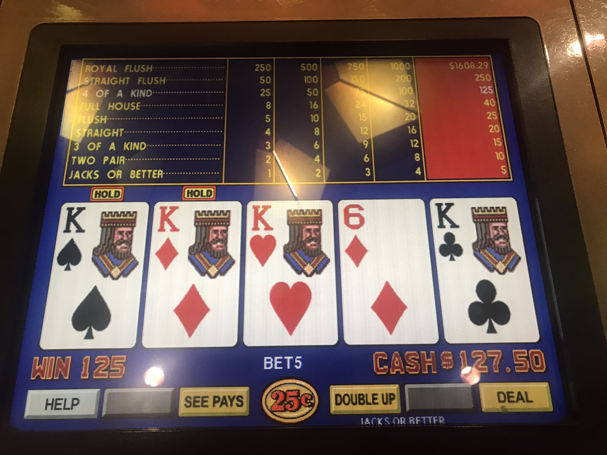 The progressive for a royal flush is over 1600. I doubt if that makes it an advantage play, but adding in the 8x comps is going to make it damn close. So I loaded up the 8x multiplier and brought plenty of bullets and insert coin.
