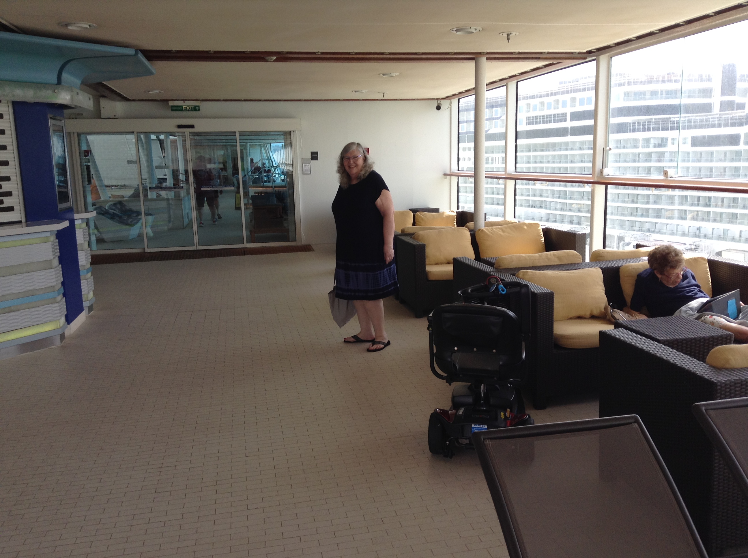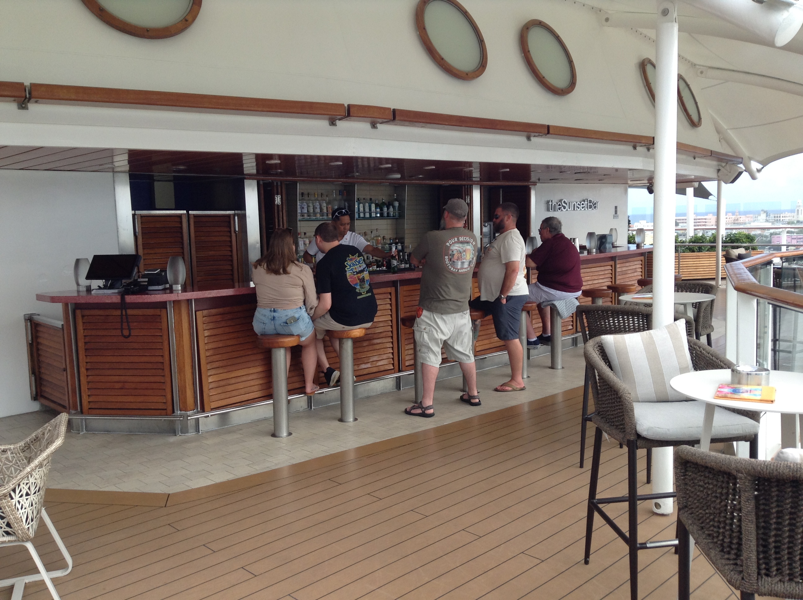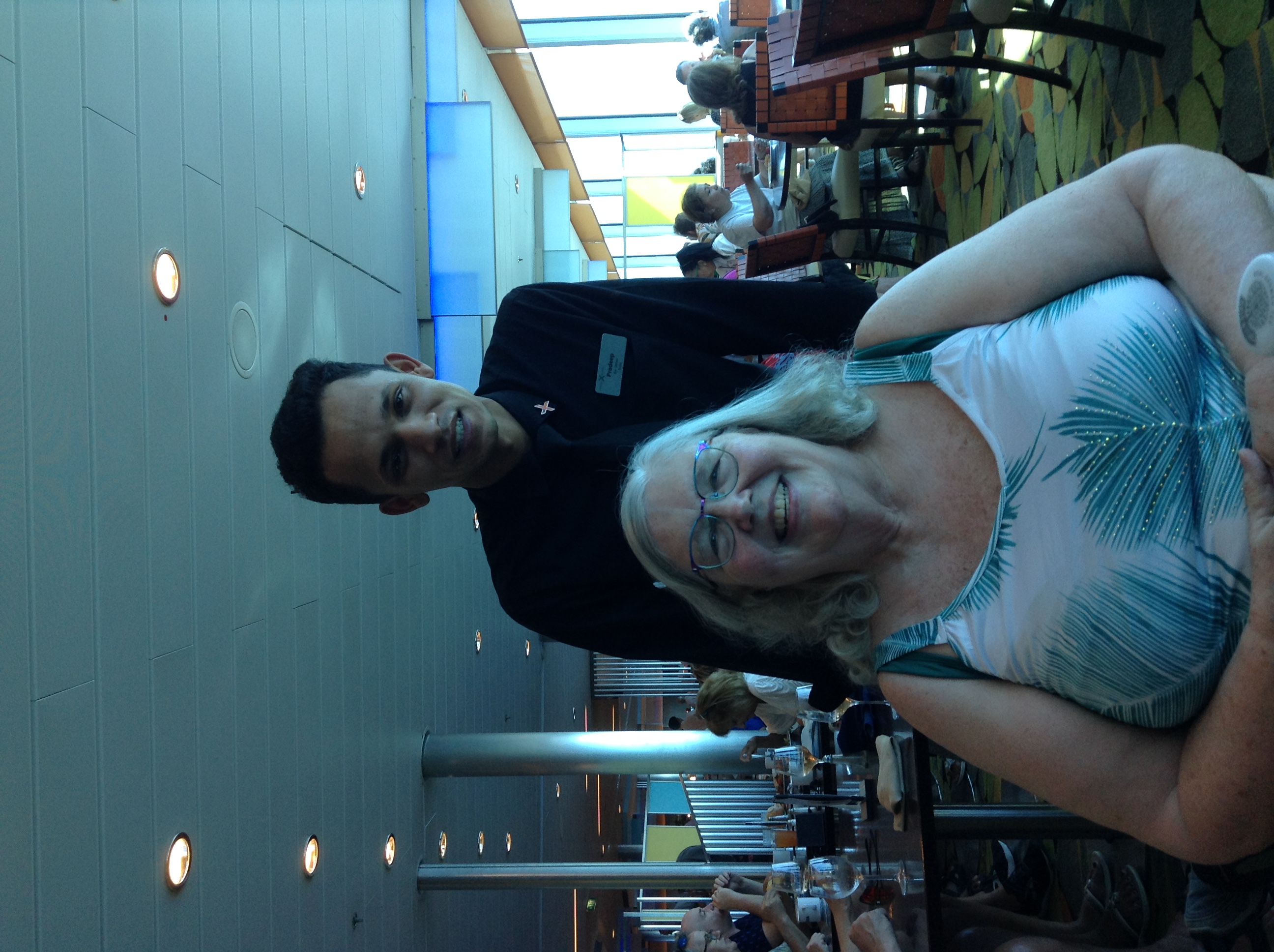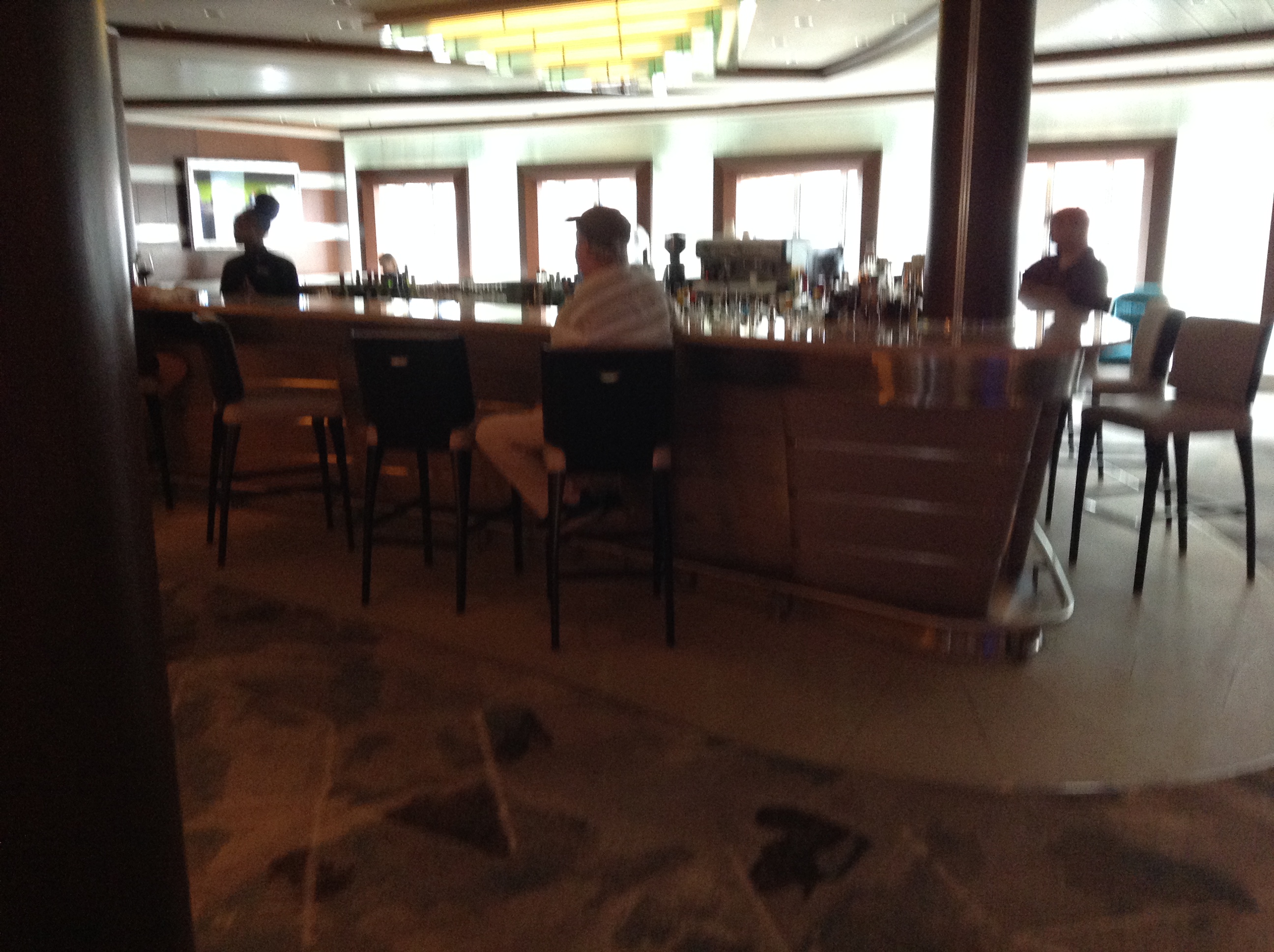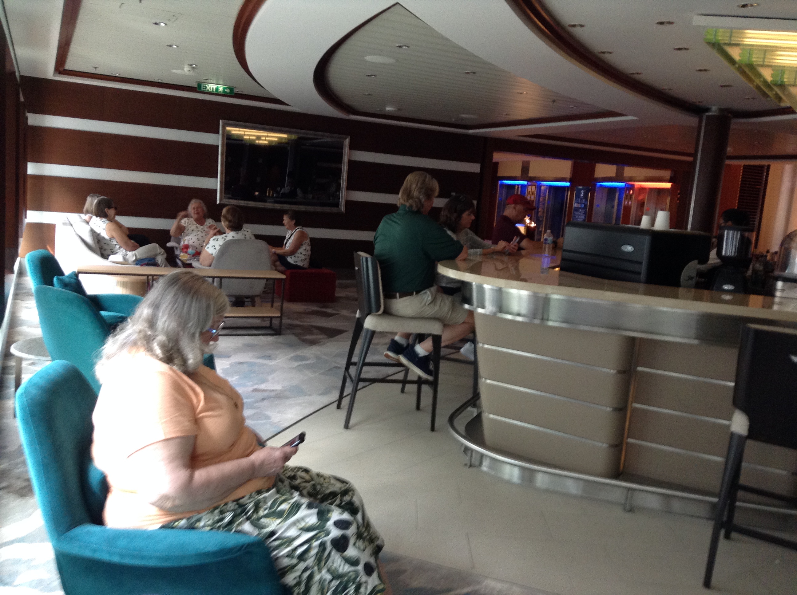 Seems to me it's always a struggle to get on the WiFi once aboard the ship. They did have a podium with a photo/wifi tech available. We bought one premium unleaded package and I get one free for being Sapphire, the uppity blue card. They hooked me up. Then we met Chu Chu bartending at the Passport. She had her hands full with a rowdy guest. Really lady? Chu Chu also worked at the Buffet in the evenings. These guys are everywhere. The nice lady DJ finally came over the intercom to announce that the rooms are ready. Cool.