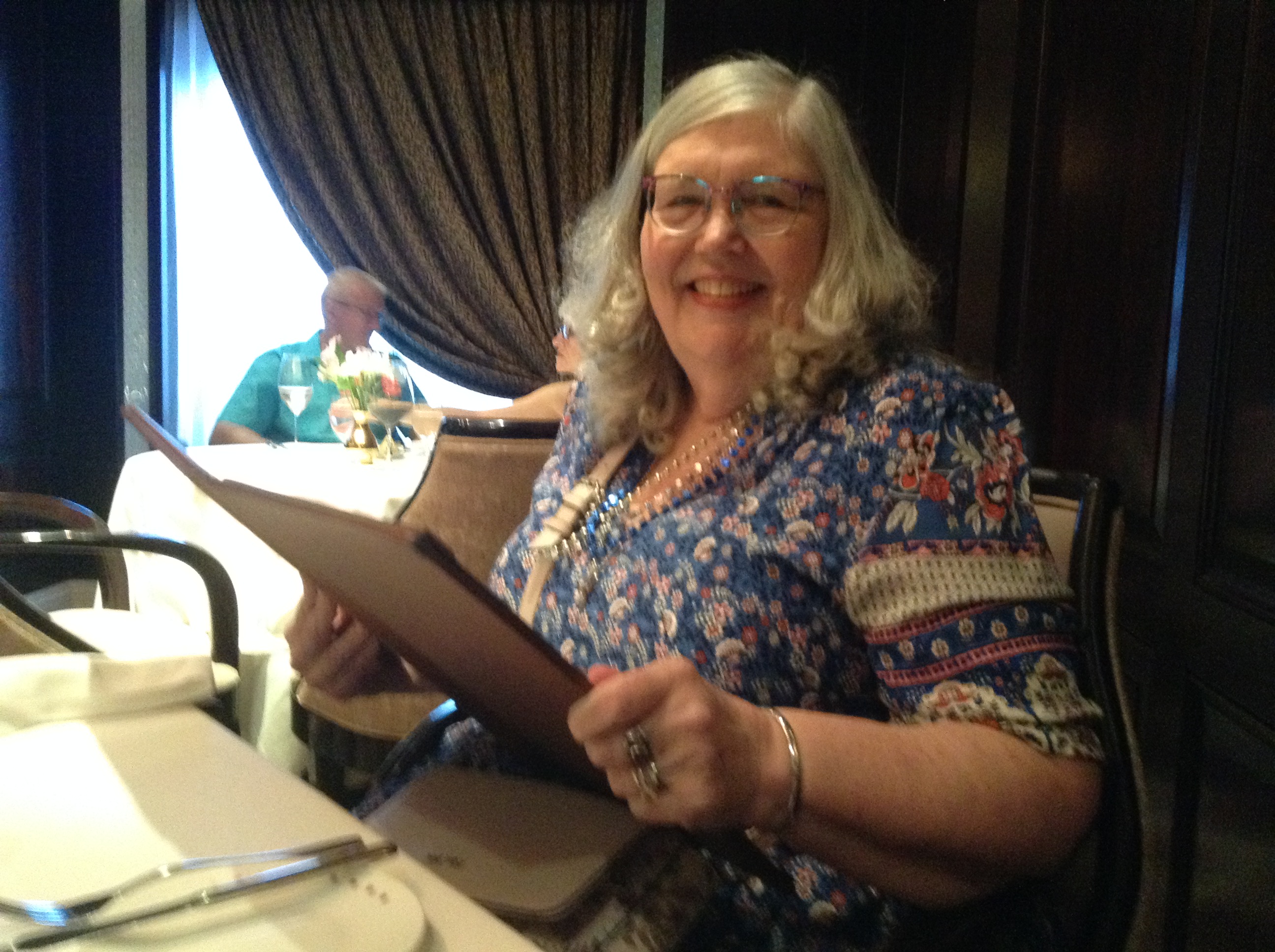 Welcome to the Celebrity Eclipse! We find our muster station and checked off that one and went to our cabin- 9292. We dropped our parcels and loaded the safe, got our sea pass cards and left. Nice to be able to get rid of carry on stuff right away. The rooms are usually ready around 1:30 or so. Never saw Johnny our attendant. Since we are in Concierge we get to have lunch in the fancy eating parlor, Moonlight Sonata. This used to be a perk for Prime Access too- but not anymore. But it is nice to be able to avoid the crowds upstairs at the buffet. We passed by El Bacon (Cafe al Bacio) and grabbed a small table in that strange middle wall in the cafe. I call it the fireplace because that's what it's always looked like to me. The manager came by and asked if we had been waited on. We said no, and he took our order. He apologized for the service.