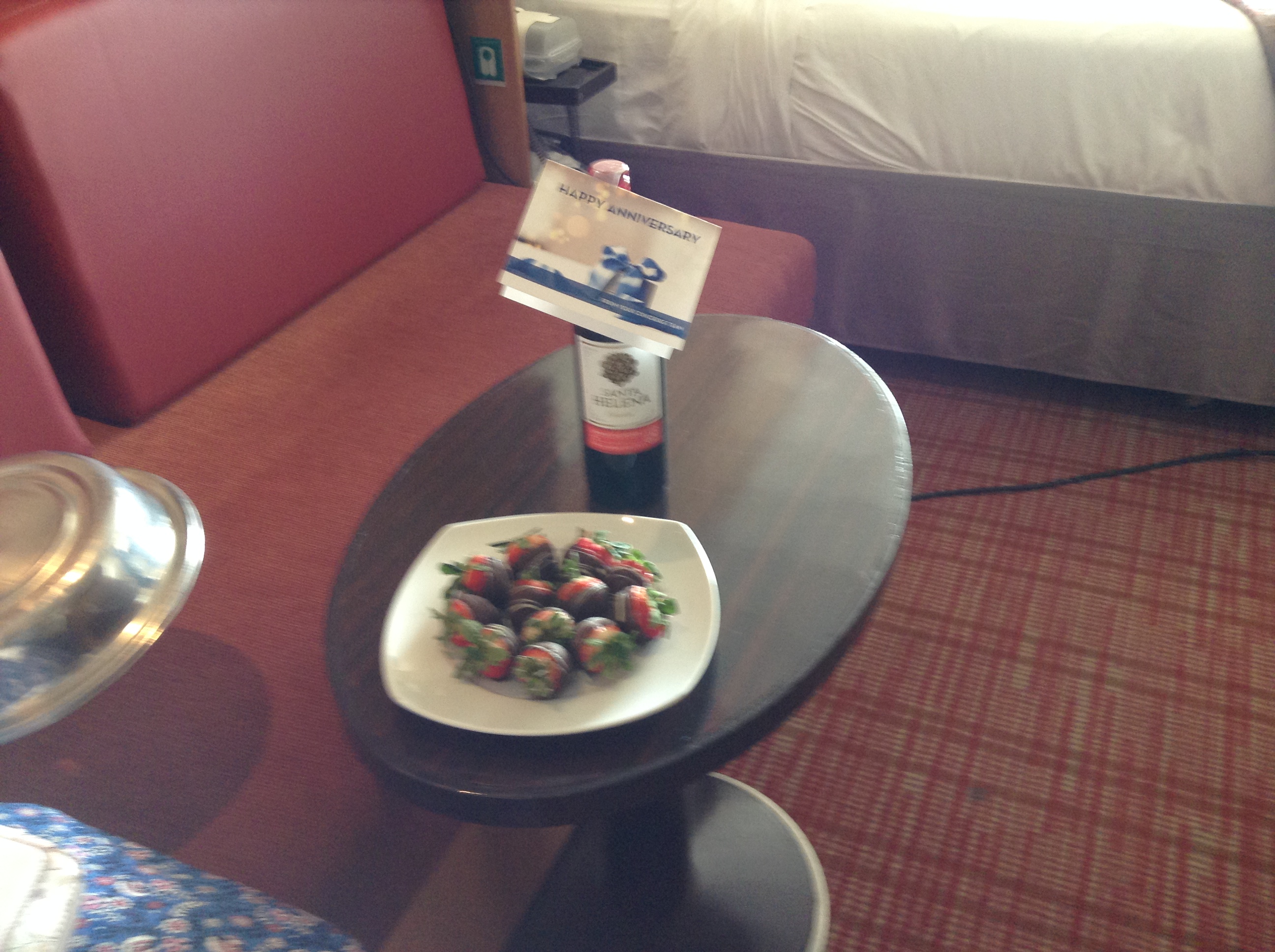 I guess there are some hidden concierge perks available after all. Chocolate covered strawberries and a bottle of their Peruvian Red. We hung out for a bit in the room. I needed to finish the stage lights anyhow.