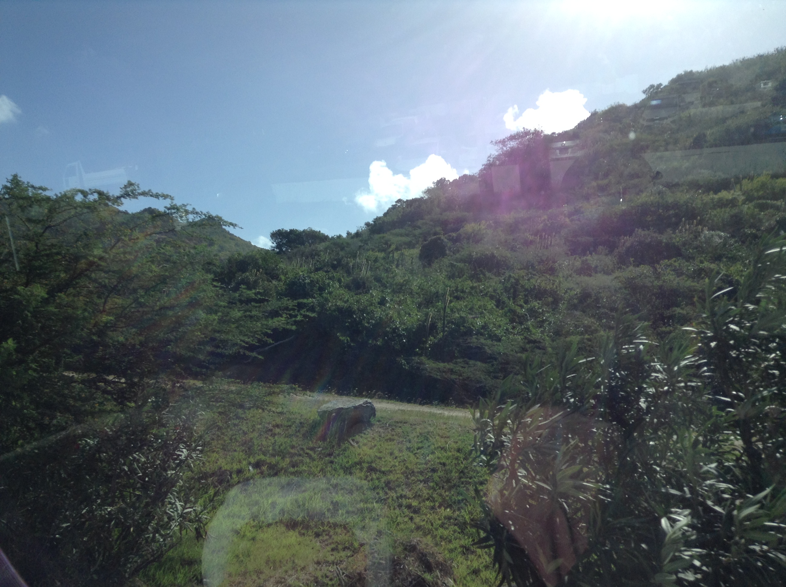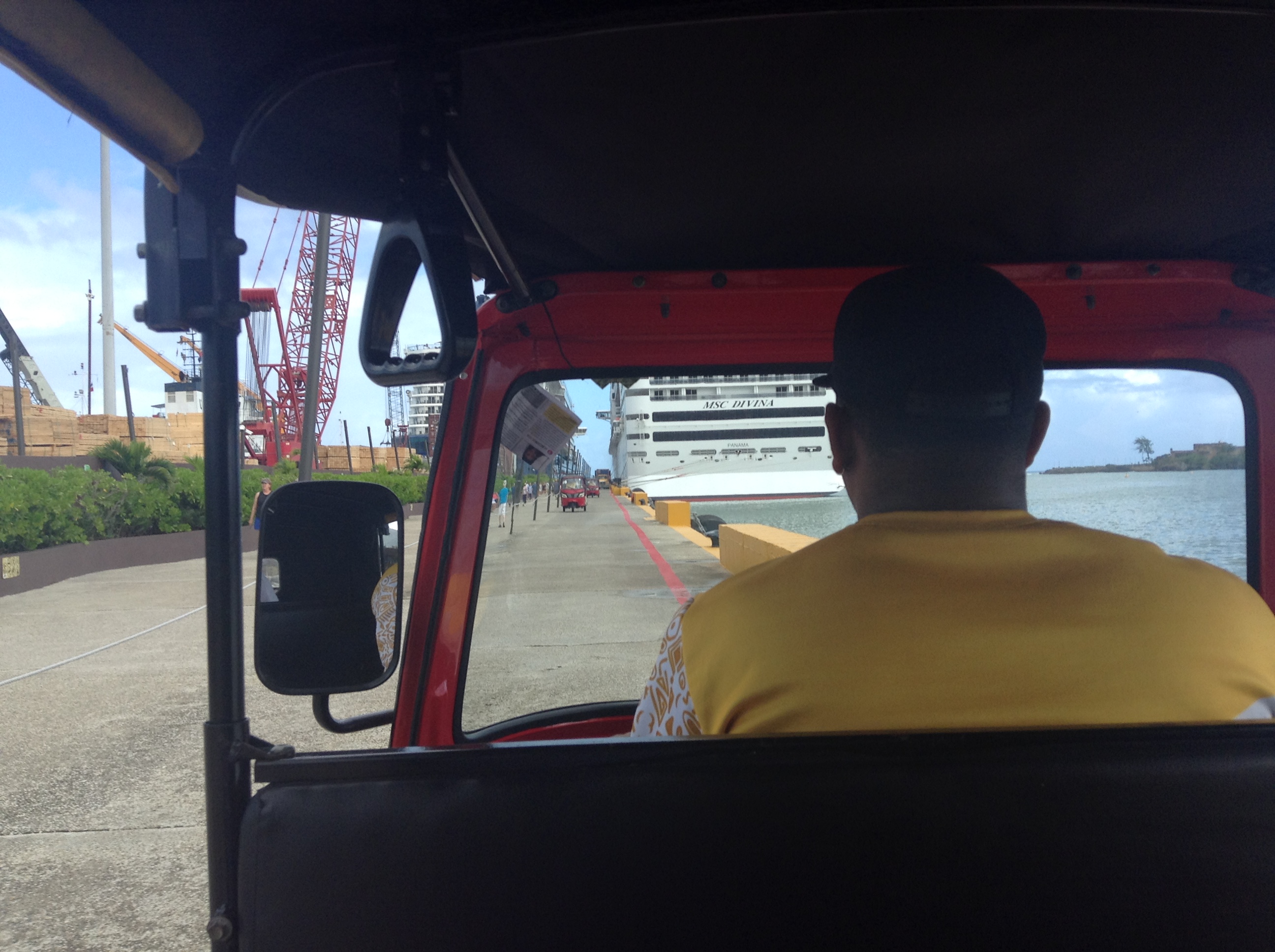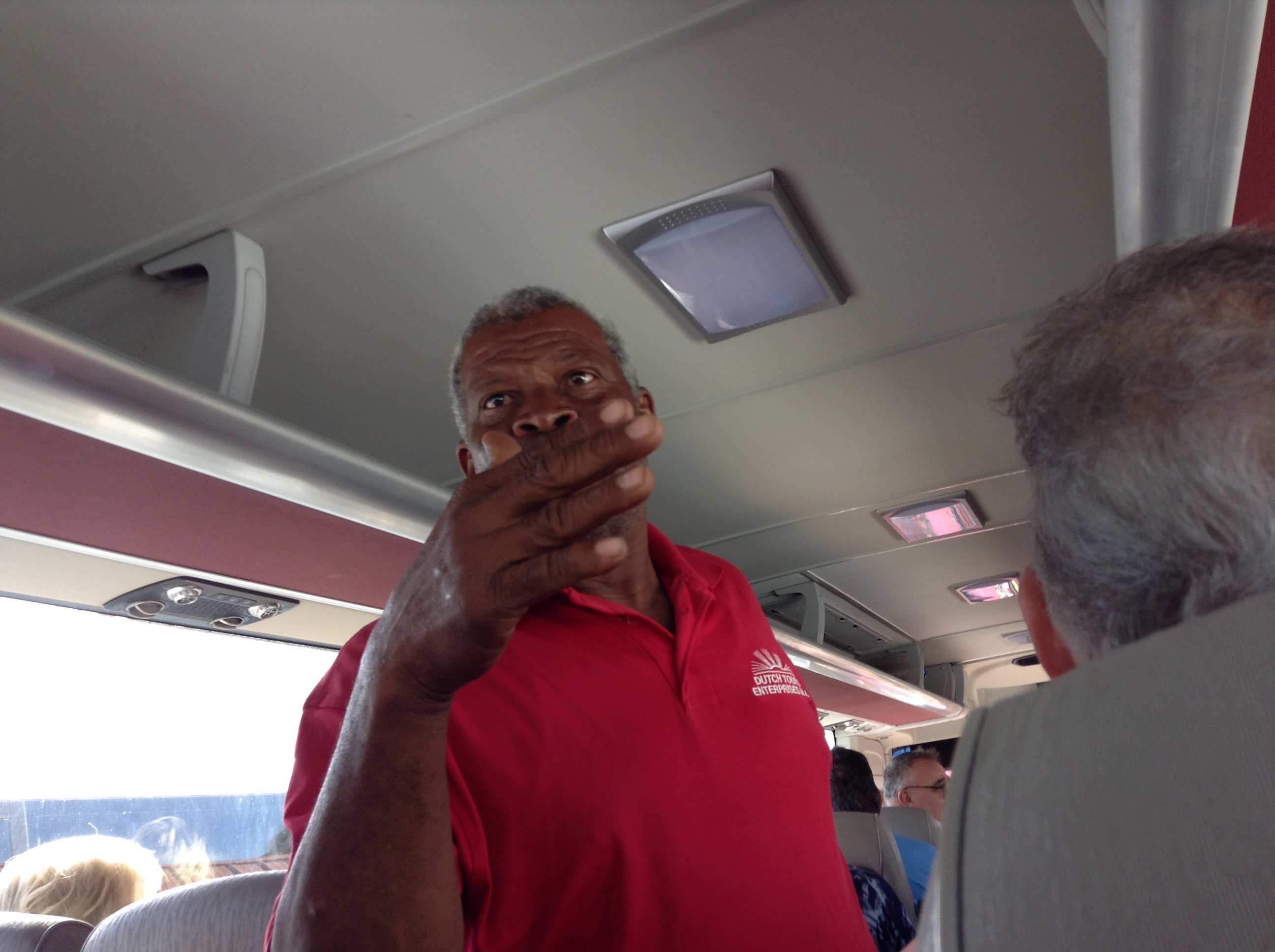 Hey Now! A bit of a changeup today. We are going on a rare shore excursion. I ordered this tour from the cruise line. It was on sale for some cheap price. Maybe 28.00 pp. 3 hour tour to the other side of the island and back. So we went. It's a fairly long walk to where the tour busses park. Pretty humid and steamy too. We are herded and routed to an awaiting coach.