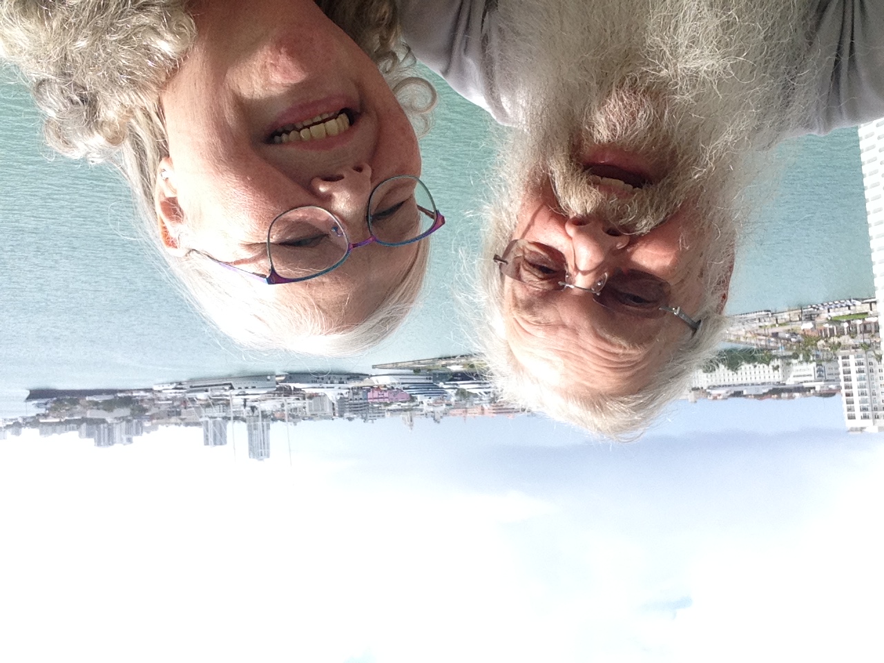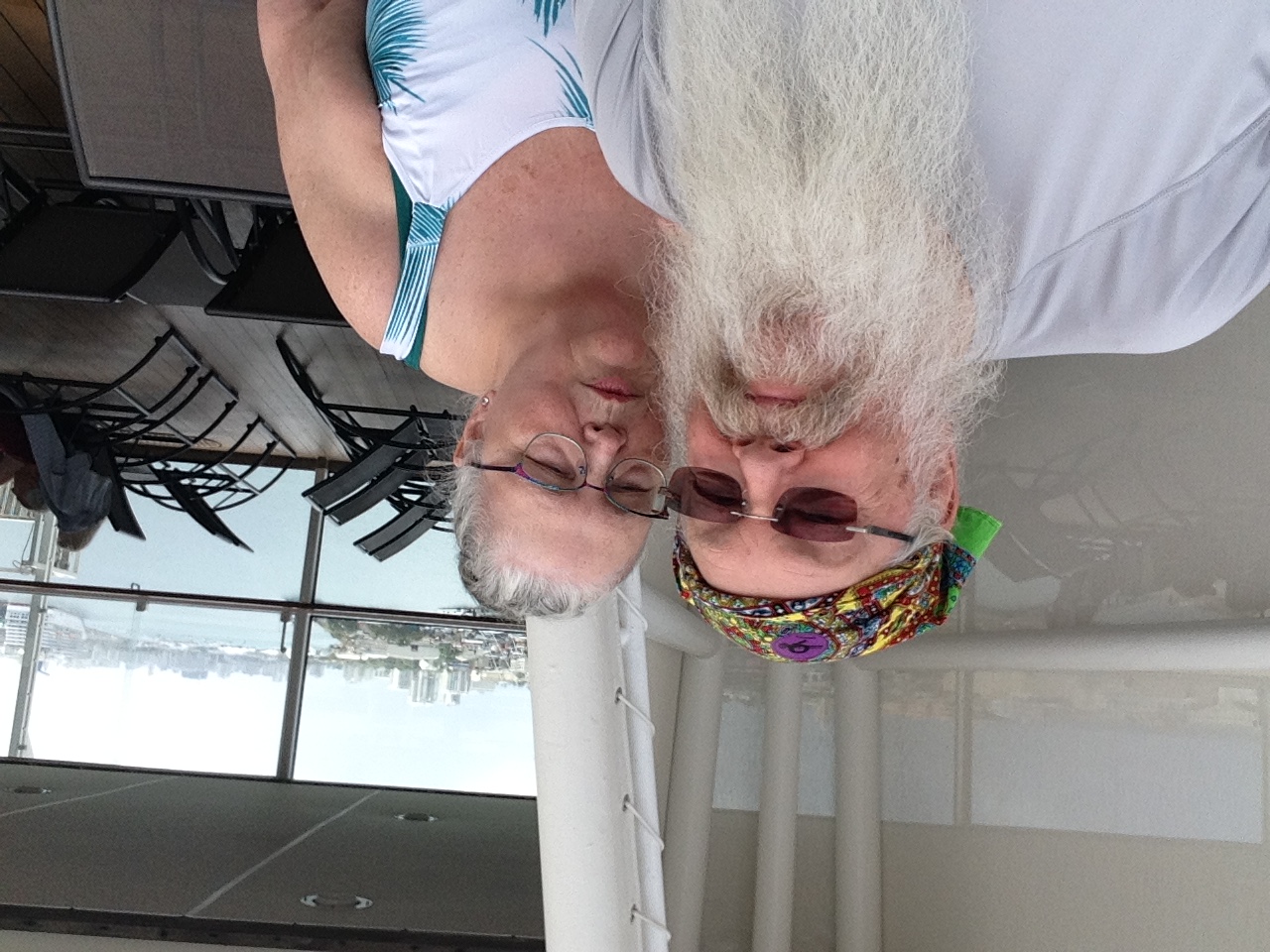 We enjoyed lunch at the Spa Cafe and since they only have a hand full of tables here we noticed two ladies searching for a seat. Our table was a four top so we invited them to join us. They are today's cruise ship locals, Sue and Judy. Sue has on a t-shirt that says "Woman with Altitude" . She lives at 9,000 ft above sea level. Damn near off of the grid. She's 83. Her long time friend Judy lives in Denver- a mile high. She's 81. We are at 12 ft. A random lady at the next table sez 0 ft. - Va. Beatcheey. Sue and Judy always get the hell out of Colorado for a couple of weeks each winter. Quite on their own. We had a jolly old time hanging out.