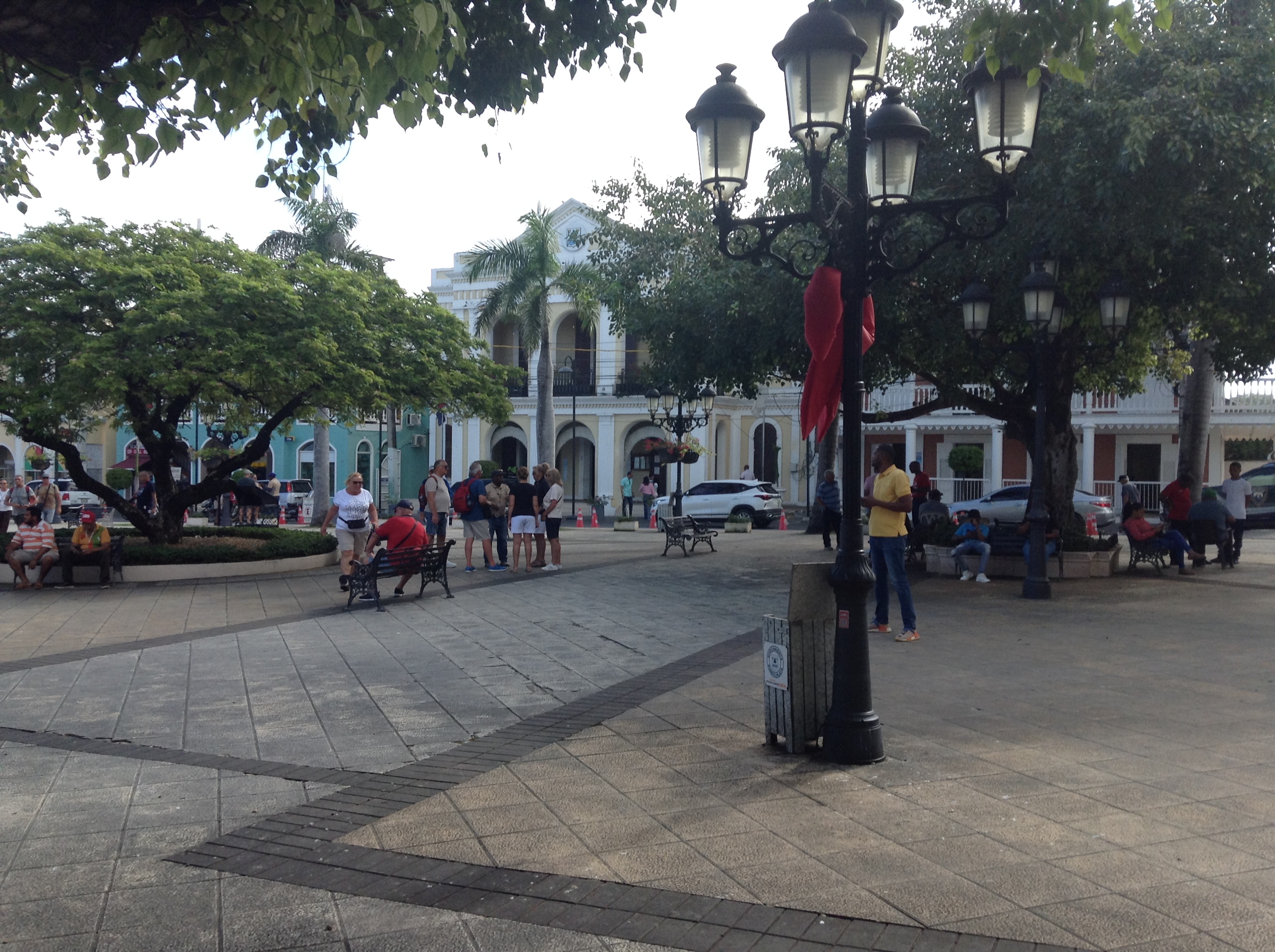 Well that took damn near 10 minutes just to get to the taxi stand. Helluva installation. Bars, shops, water rides, and restaurants abounding. I join a group of likeminded people from the ships who are looking to go downtown. A couple of people say they are going to the church in the town square. Seems like a good start. I start talking to a nice lady who was also kinda tagging along with this group. She introduces herself as today's cruise ship local, Julie. She is representing for siblings and her young daughter and solo. Since I was too we pair up to explore. Julie has lived in Puerto Rico and around the US. We walk. First stop Umbrella St.