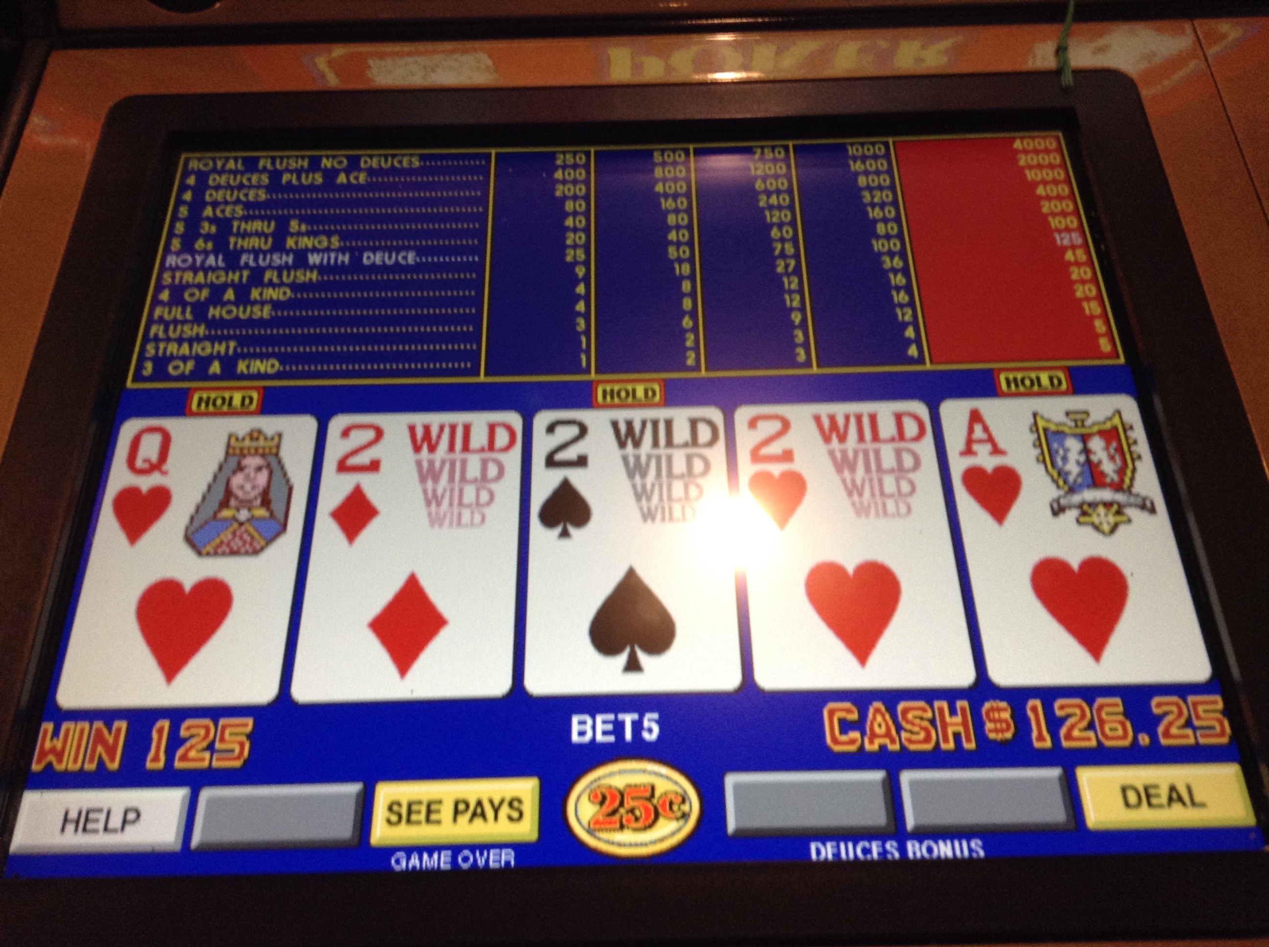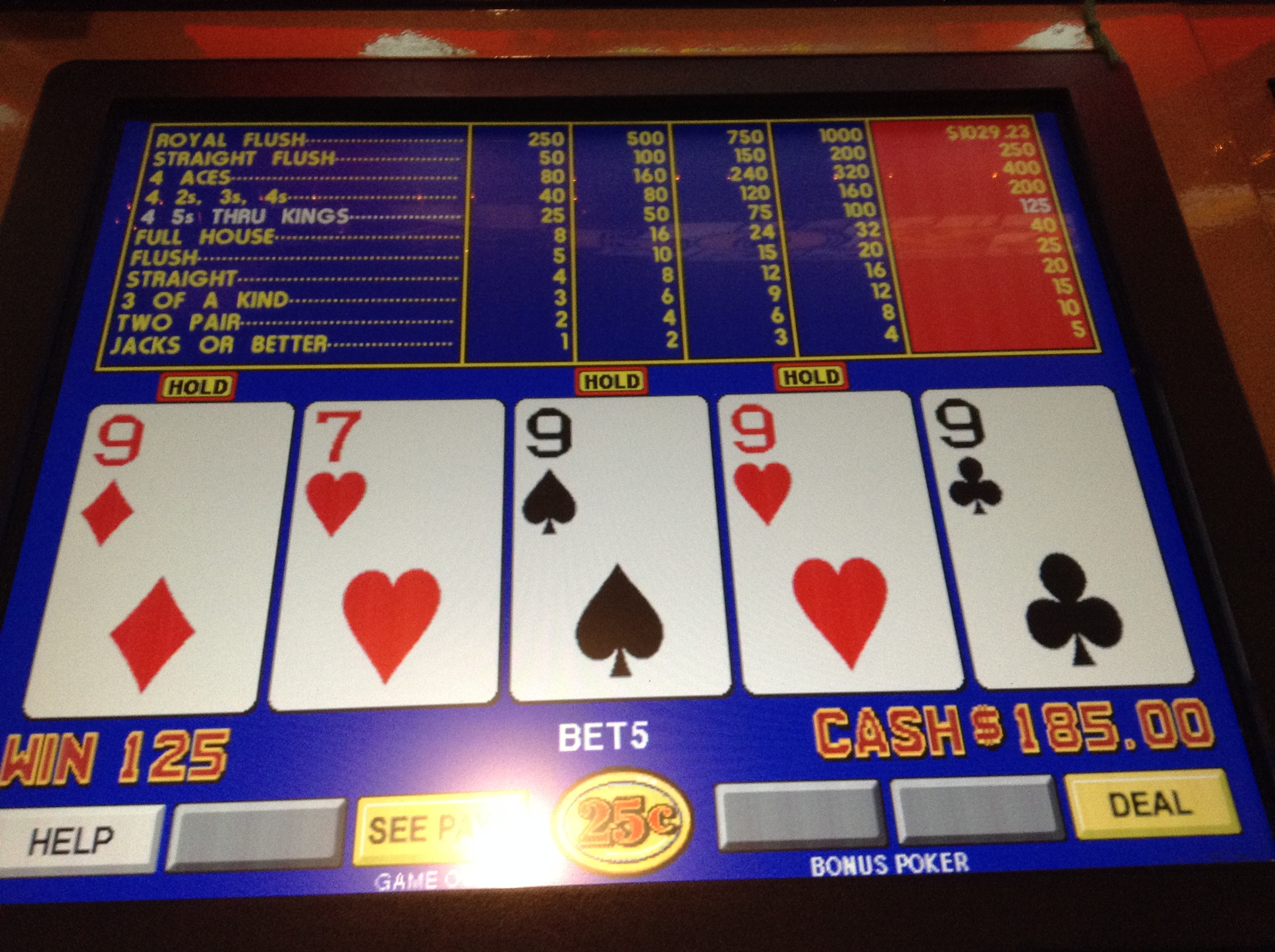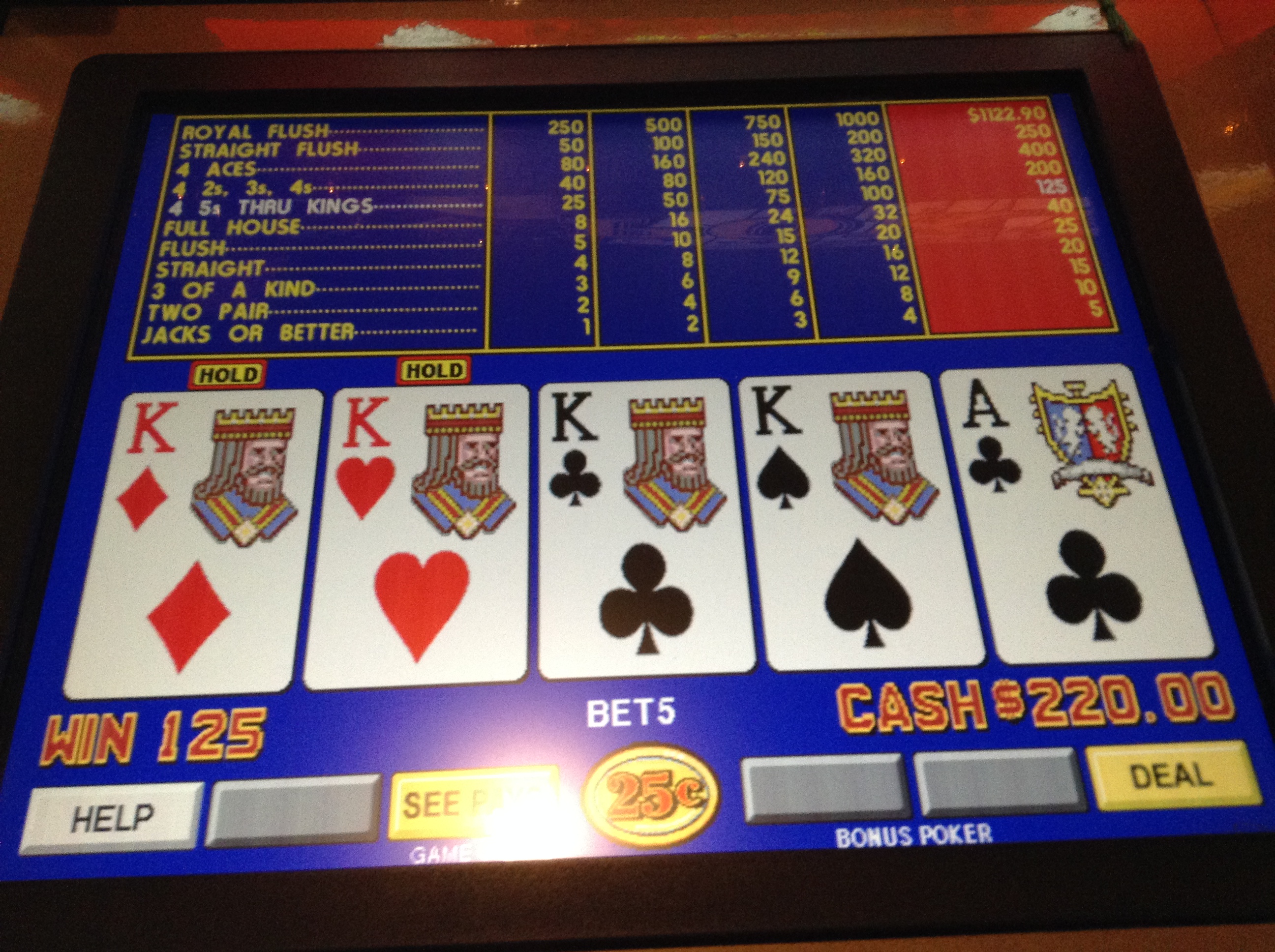 No, that isn't an optical illusion. 3 5OAK 3's. The first one was all on the re-draw. Savvy! Mark arrives, and we walk over to Billy Bobby Joe's Bar. I sit at the .25 8/5 progressive slants adjacent to the bar while Mark bellies up. Insert coinage.