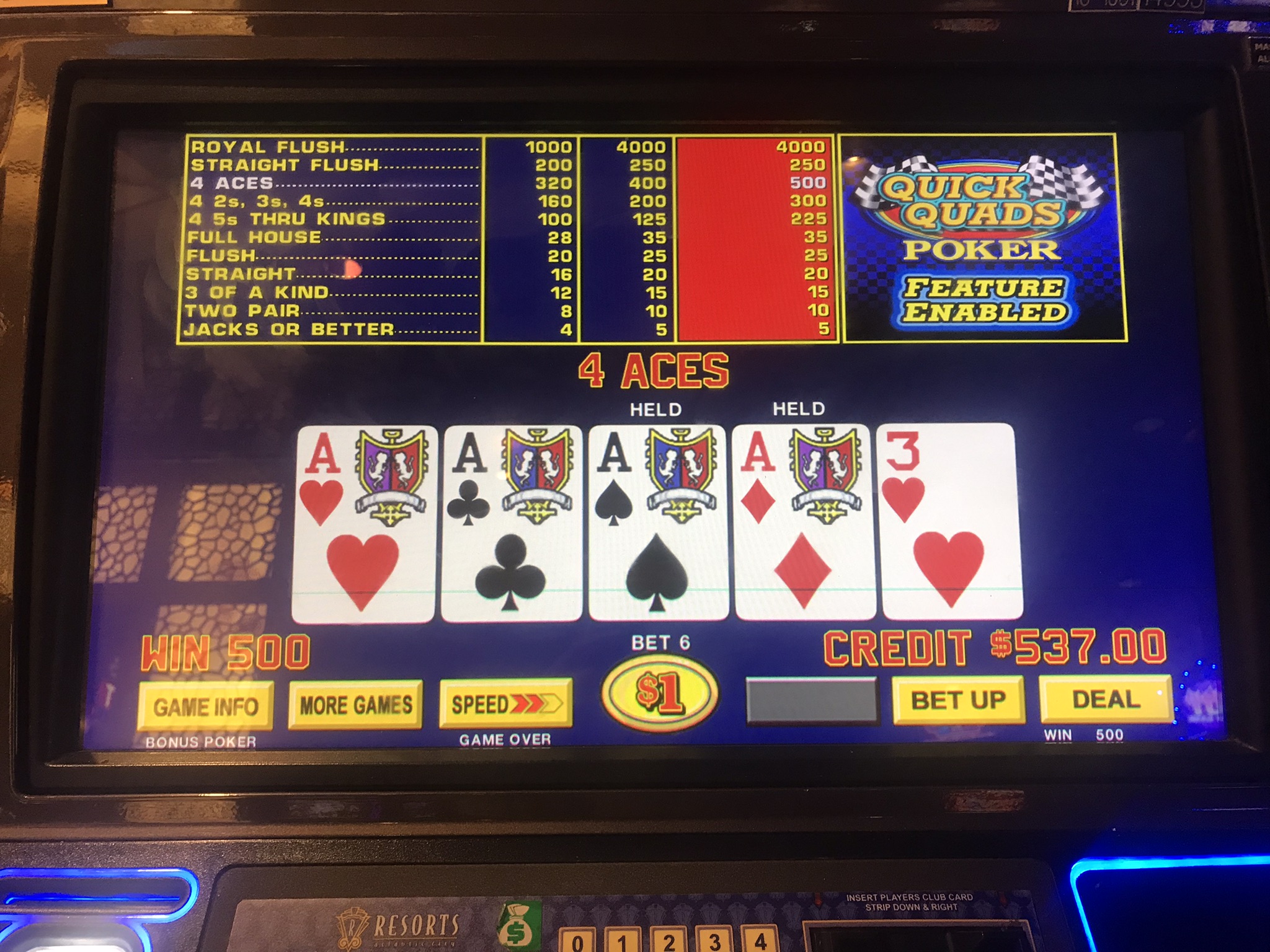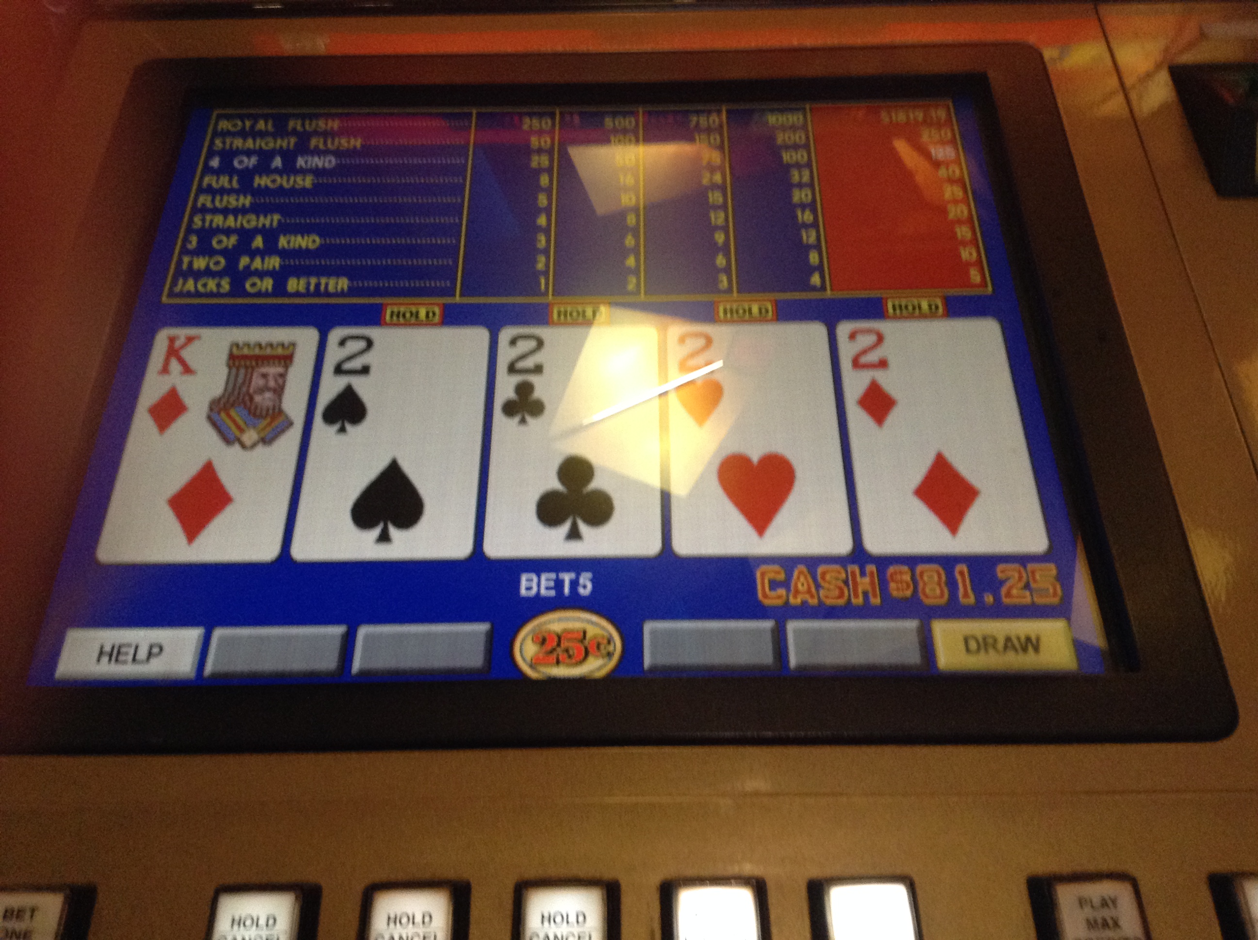 The progressive for a royal flush is over 1600. I doubt if that makes it an advantage play, but adding in the 8x comps is going to make it damn close. So I loaded up the 8x multiplier and brought plenty of bullets and insert coin.