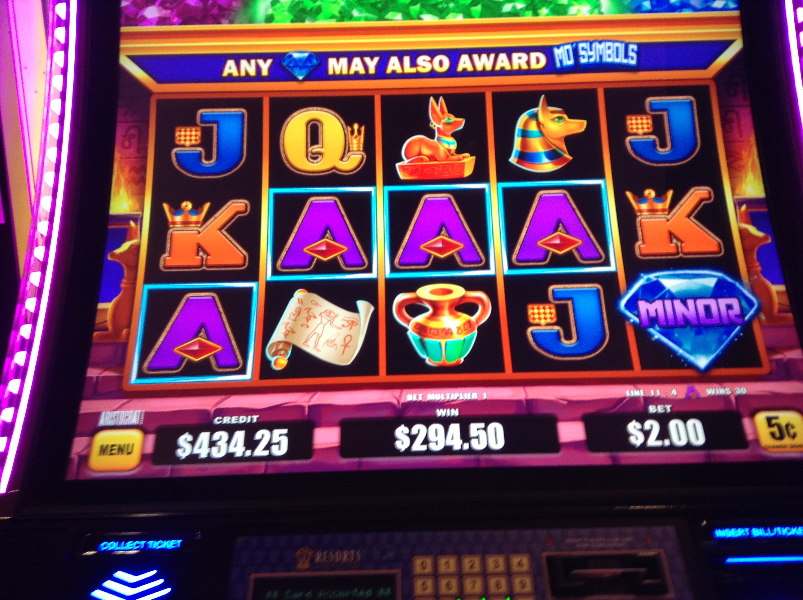 After that quad I just stopped taking pictures of them. I took a break for some lunch at the club and went straight back to work. By my bookkeeping I hit 21 quads. 3 were deltas. Then around 6 p.m. I am joined by another player. She calls over a slot attendant and asked them to lock out one of these 3 progressive machines to reserve it for her brother. He must be a high roller here because in short order it's reserved. She takes the other one. We chatted as we played. After a bit her brother stopped by but never sat down. She finally gave up on him and had the machine unlocked. She sat down and started playing on that machine. She hit it. $1672. Just like that. Oh well, I was about done chasing that darn thing anyway. Good for her.
