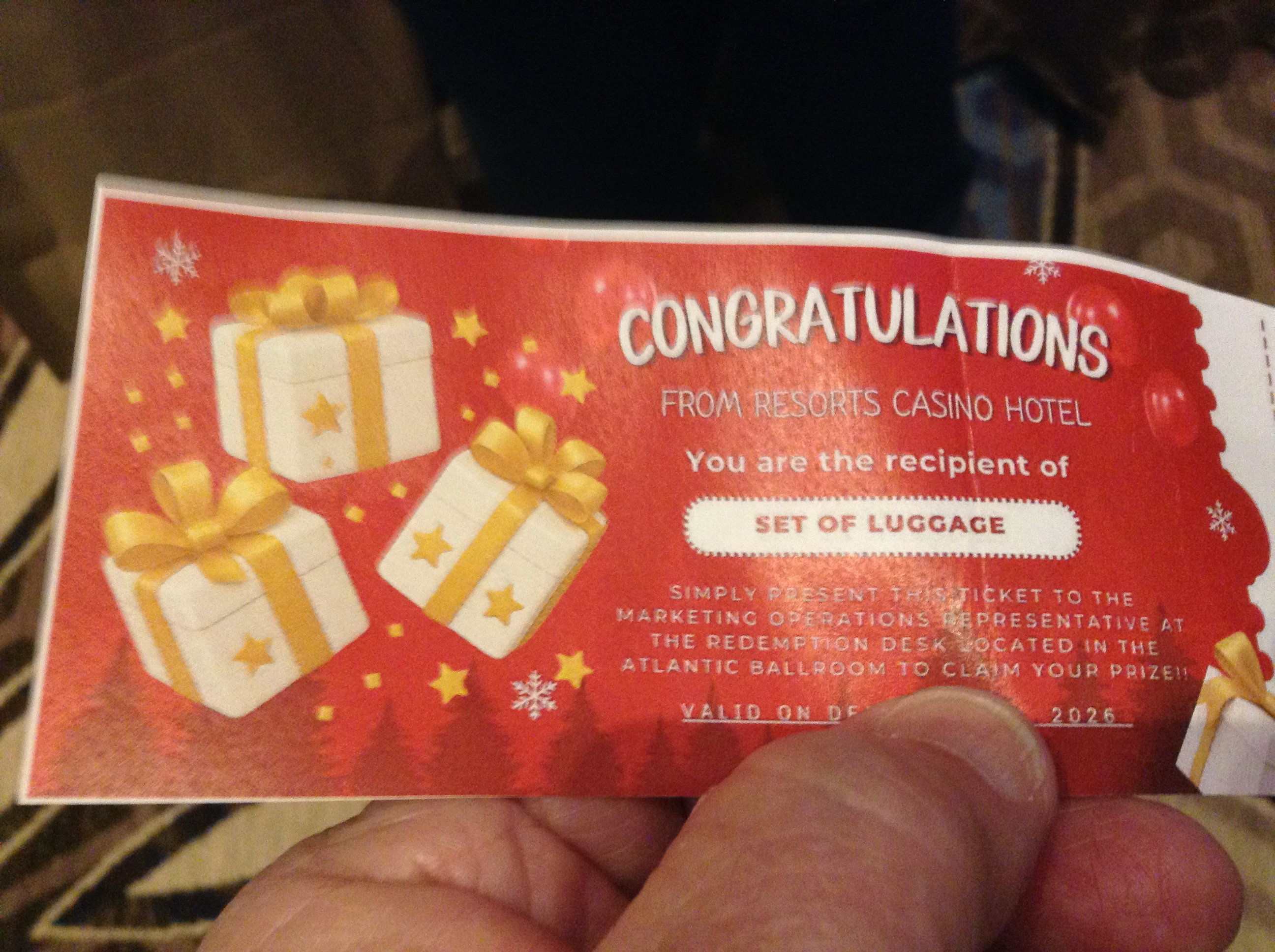 So this is where all of the people have been this whole trip. Waiting in this frilling line for hours. I finally got in and an attendant asked after my Host. "Stephanie, but she is on Vacay." Head on over to Tom. "Lovely." There's a line of Player Development personnel on one side of the room. They each have a small high top table with a fish bowl on it. The fish bowls have envelopes in them. Here's mine.