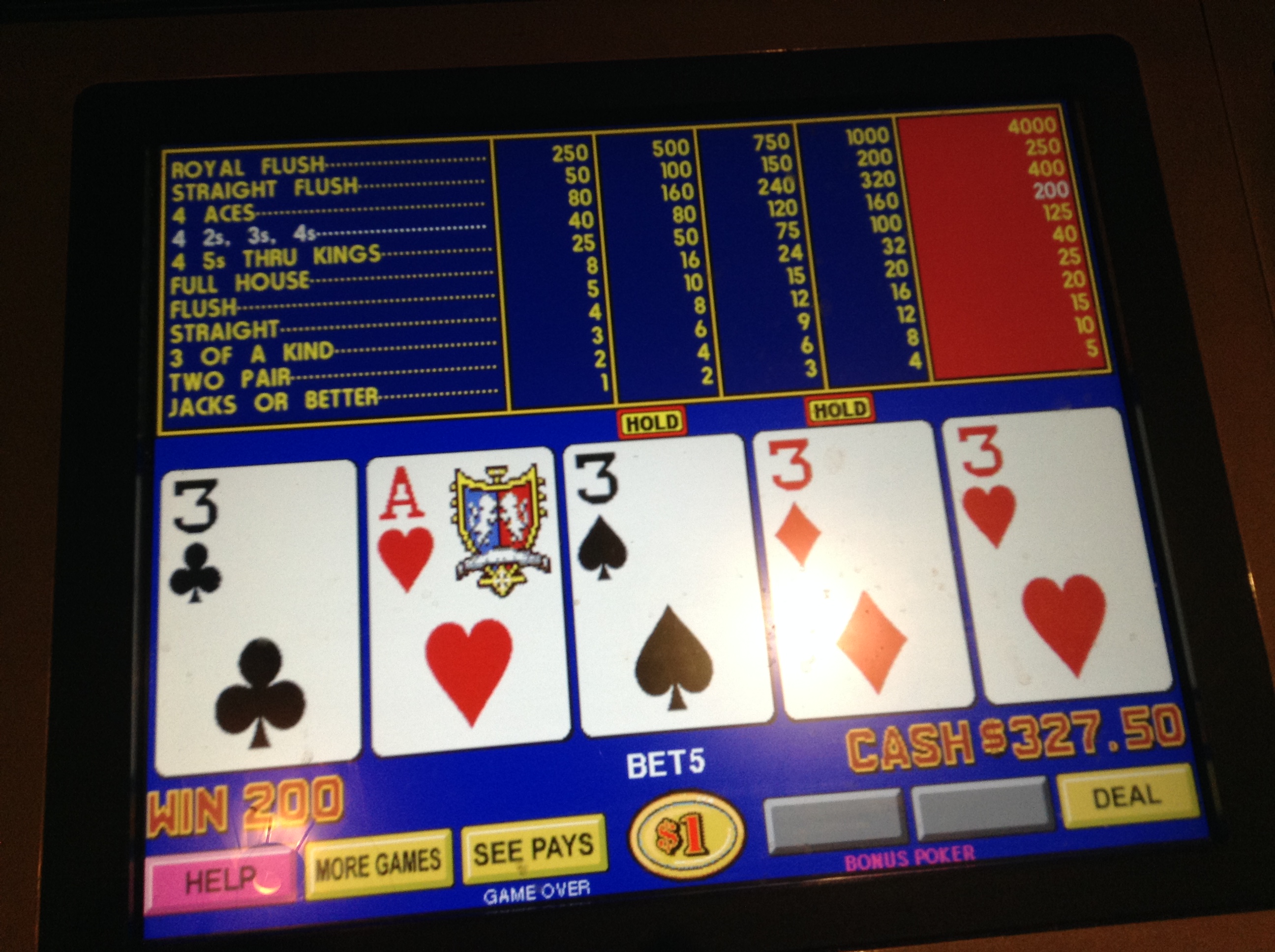 Obviously this is like an updated version of Sigma Derby. .50 minimum bet on the exotics. A saw buck for WPS. We lost $10. Stopped by the 5x/10x/Quick Hits and dropped a Quick Hundy. Back over to the sparkling new slants. I loaded up today's free play- $68. I hit a couple of full boats and flushes and cashed out a hundy profit. Sweet Ti as usual is first on the 4OAK wagon with this.....