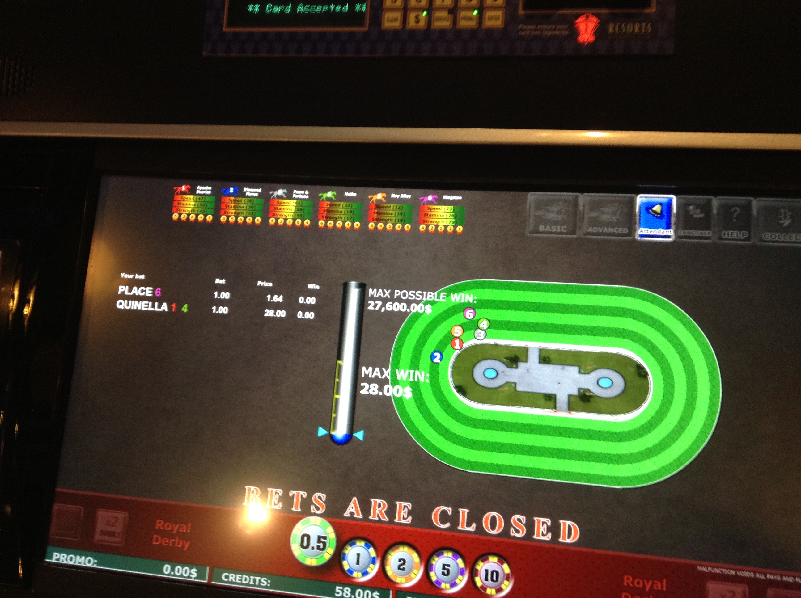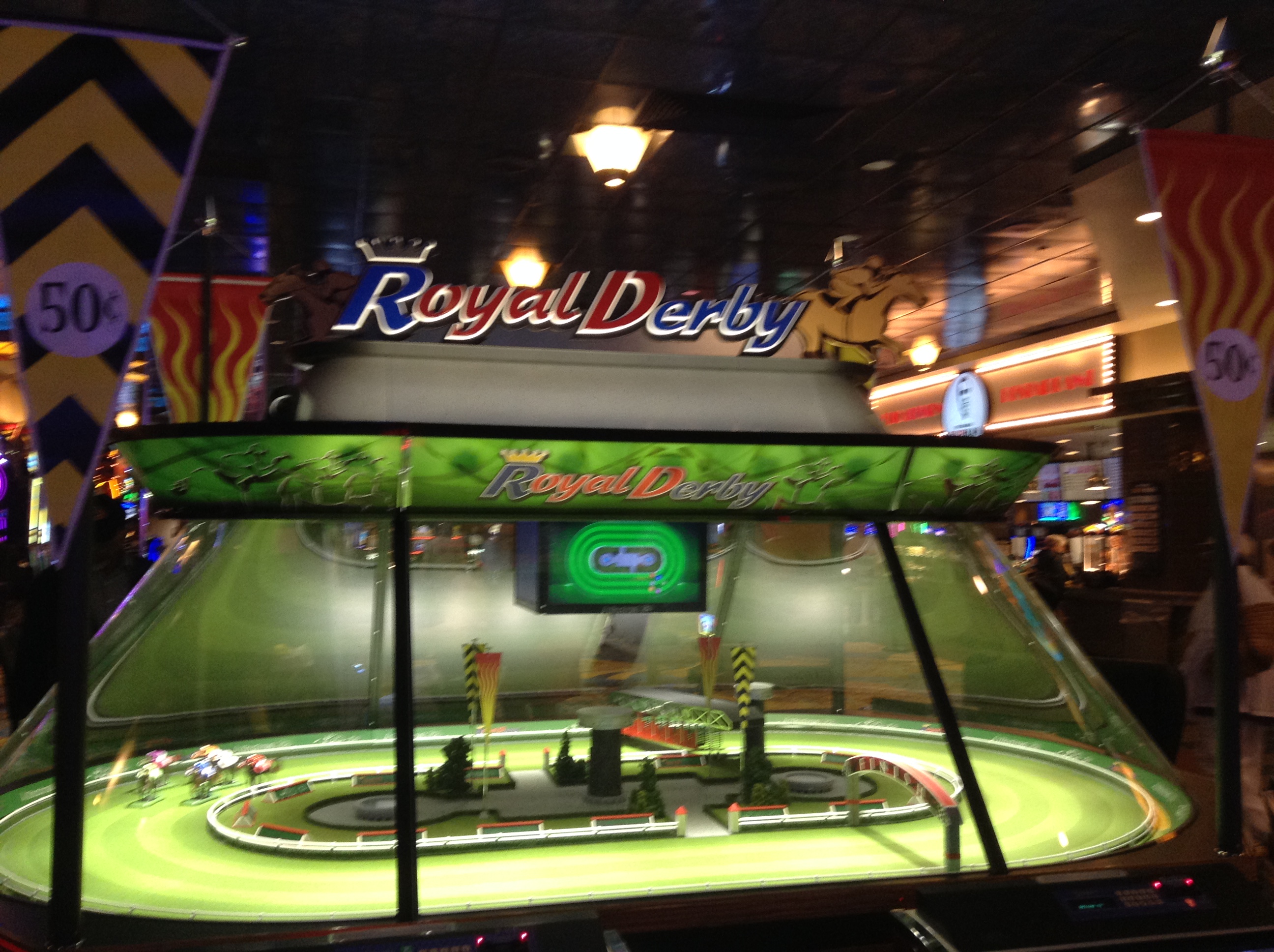 Sweet Ti wants to read, so I go down for a session. I start out on that Top Dollar I was playing last night. Bonuses: 40./35./25./60./15. Lost a hundy. Next! Triple Diamond Deluxe $1. Lost a hundy. Back to Da Slants. Lost a hundy. Notice a pattern? Double Diamond Deluxe .50 lost a fitty. Triple Double Wild Cherry .25 lost a fitty. Down to my last tenner. I hit the Royal Derby. When we were there yesterday we noticed a dude handicapping believe it or not. We had a spreadsheet set up and was recording all the info from each race. There's a whole shitload of info too. They actually do past performances on each horse and jockey before each race. Of course, there's a new race every 3 or 4 minutes so.....I played a couple of longshots and actually doubled my money, cashing out $20. That kept me from taking the walk of shame upstairs for a while. I put my last $20. into Mr Cashman and it lasted quite a while before Mr. Cashman ate it up. So shamefully I walk upstairs and get fresh bullets. Along with my Sweet Ti. On the way down she suggests we play some Top Dollar. Insert coinage. Bonuses: 45./40./35./60./60./85. It's a push. $1 WoF -50. Electronic Roulette, "nuttin' honey!" Back to Da Slants.