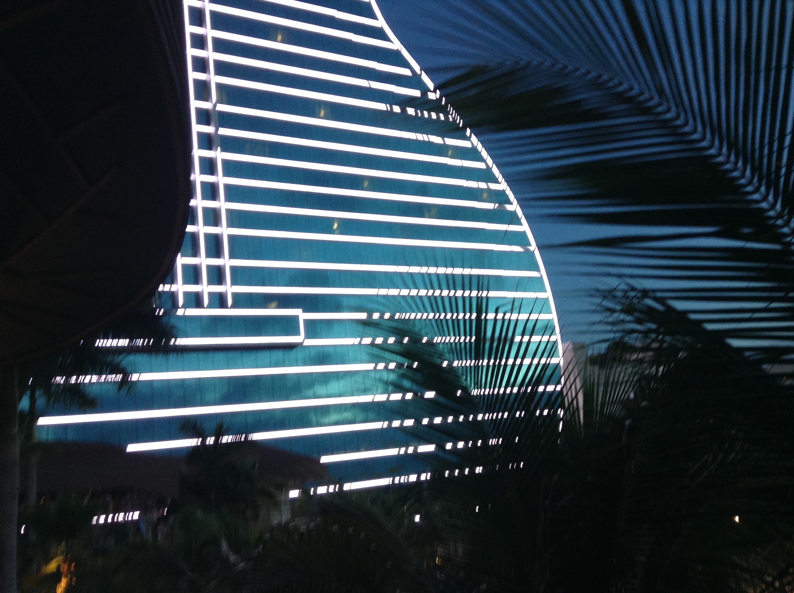 Seriously? From insult to injury. At least I found the keys. I fire up our Chicken Hawk and right away idiot light come on about this and that. About what I expect from a Willys. I brought my own EZPass and GPS. The GPS cant find any sats so I just follow my instincts leaving the airport. I stumble upon Griffin Rd. which was just the road I wanted. I'm headed for the Hollyrock Hard Rock. You know, the guitar shaped tower? Celebrity's Blue Chip Club has a nice perk that I qualified for by playing enough in their ship's casinos to have earned Sapphire, the uppity blue card. An Annual 3 night complimentary stay at either the Hollyrock or Tampa Seminole Hard Rock along with 300. in resort credit. No resort fees either. Easy enough to find the resort with a 450' instrument sticking up. This place is HUGE!