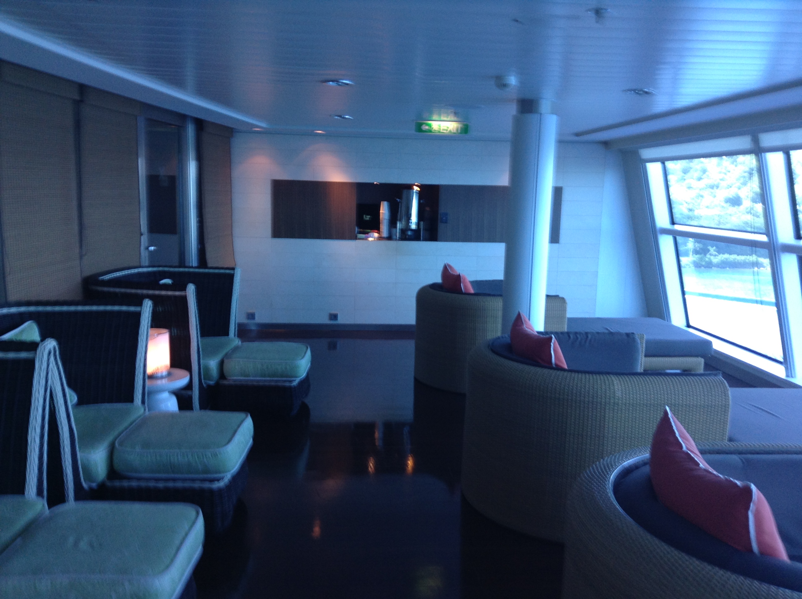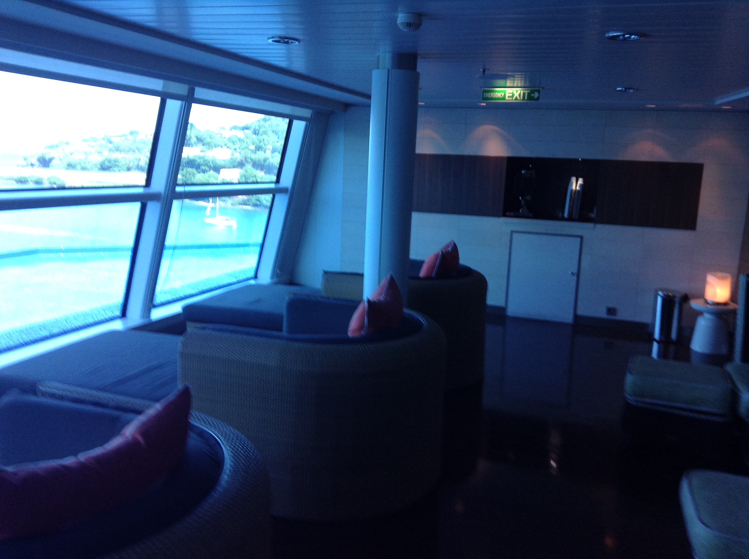Lazy afternoon. Thunderstorms set the stage for serious nappage. One nice thing about having our room all the way at the end of a long walk to the stern of the ship is the quietness of the room. Plus being on Deck 7 gives us the sandwich effect of rooms above and below you for a couple of floors to dampen the possible noise pollution from various venues. Nothing but net. We make our way down to El Bacon . They hold a happy hour every afternoon for Elite Captain's Club members. Which we are not. Give us a couple of more years and we will though. We are due to leave at 5 p.m. Just ahead of that we hit the VP machines in the casino.There are only 6 VP machines here and one of them is on the fritz. And there are a good dozen serious VP players on this cruise and it's really tough to get on one. Our alert server, Johnny is on the spot and brings us a round. Sight unseen. The Reflection wait staff is second to none. Time to insert coin.