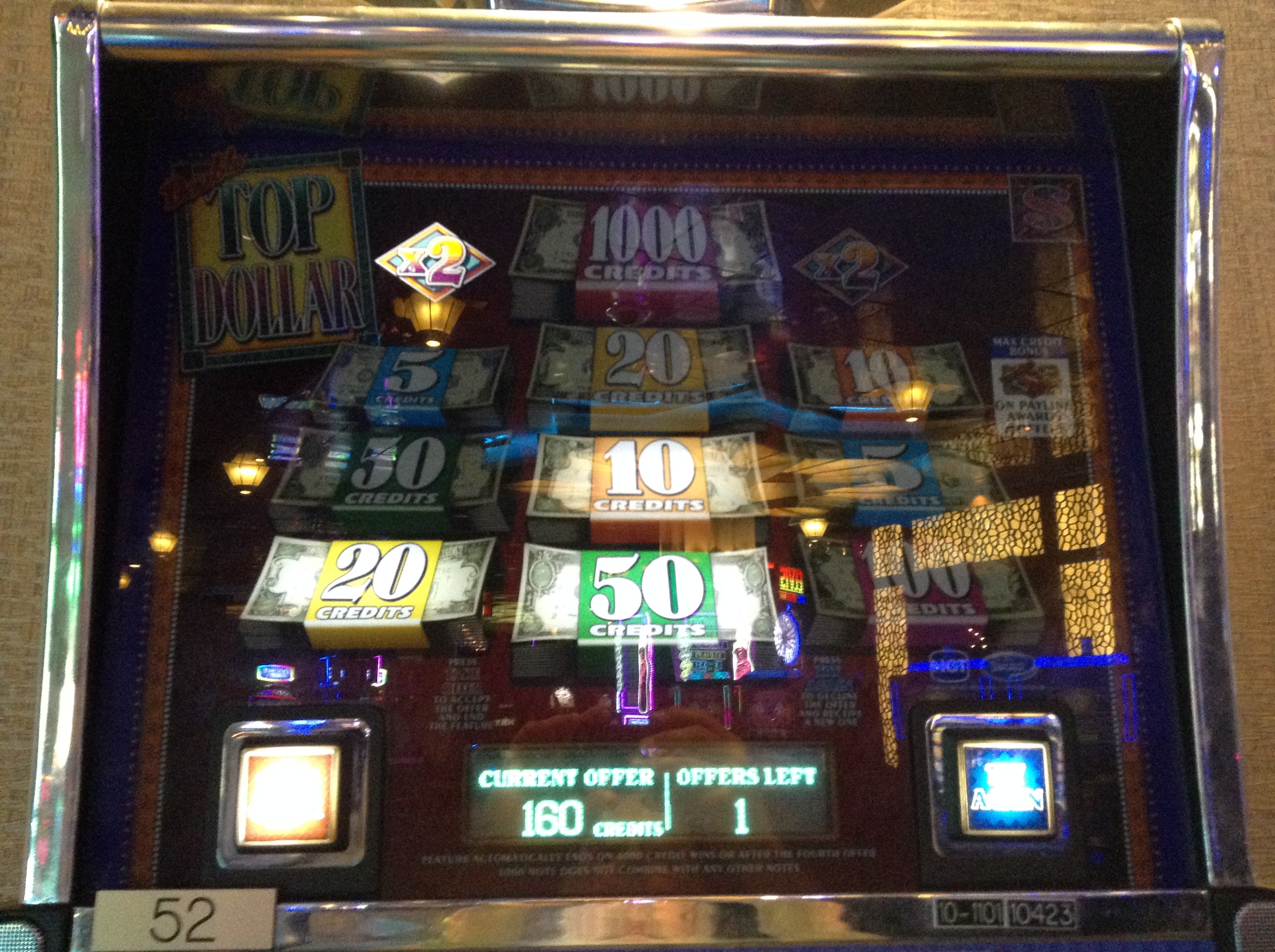 I burned through my free play and Mark's but still couldn't snag that dammed lumberjack unicorn. I went upstairs to pack and grabbed some more bullets. Sweet Ti and I chatted for a bit and she suggested I play some Top Dollar on the machine she hit the 1000 credits on. It's an old school .50 denomination model. I concur. As a matter of fact, I'm feelin' it. Insert coin.....