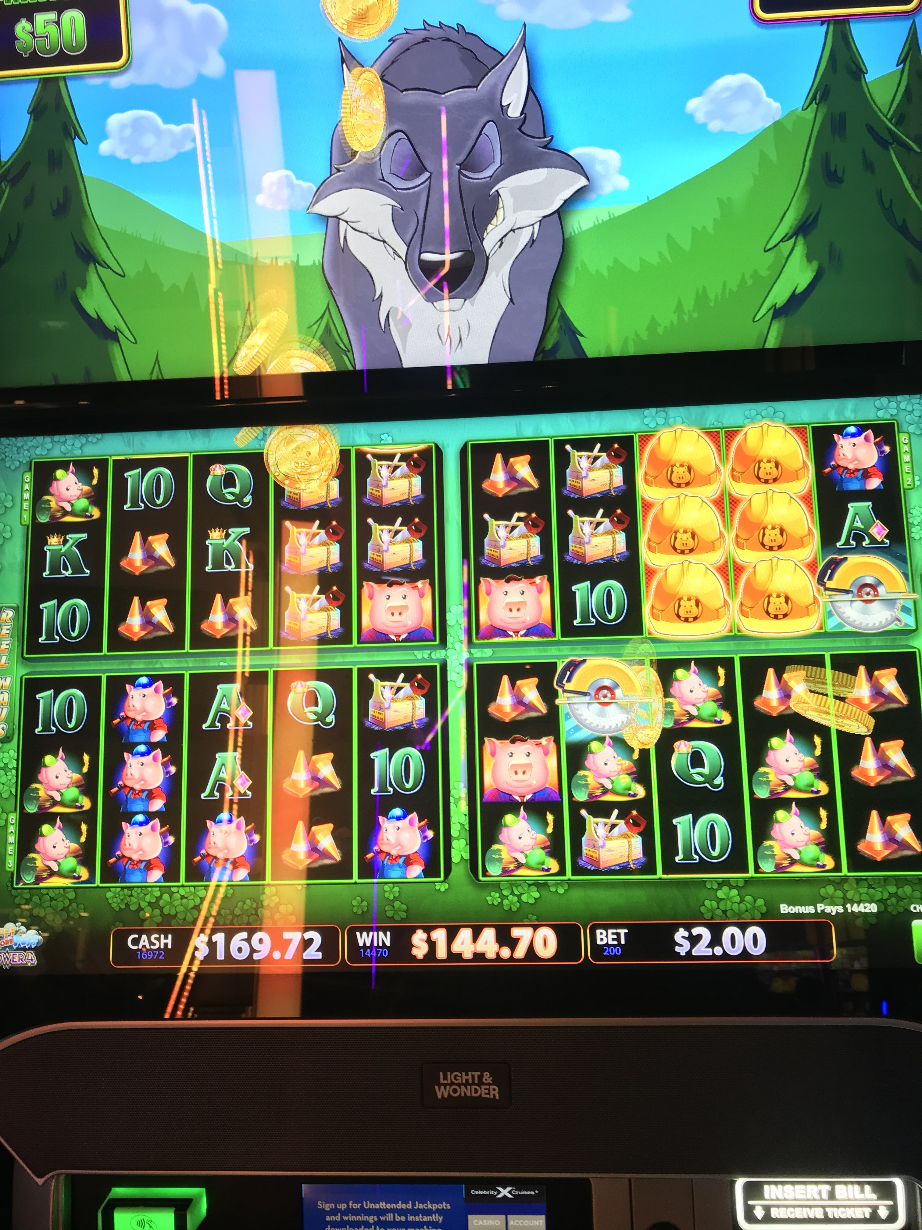 So every evening they have a so called Snowball Raffle. One lucky player has 10 minutes to respond to their name being called. One entry per 100 points earned in the casino. Nobody won it last night. I'm playing with Bob and Eddie and boom! they call my name. So I jump up and head for the cage. I'm standing there in line and get up to the counter and the tller says that I've got to go to the host desk. That's on the other side of the casino. "You have 2 minutes!!!" I made it.