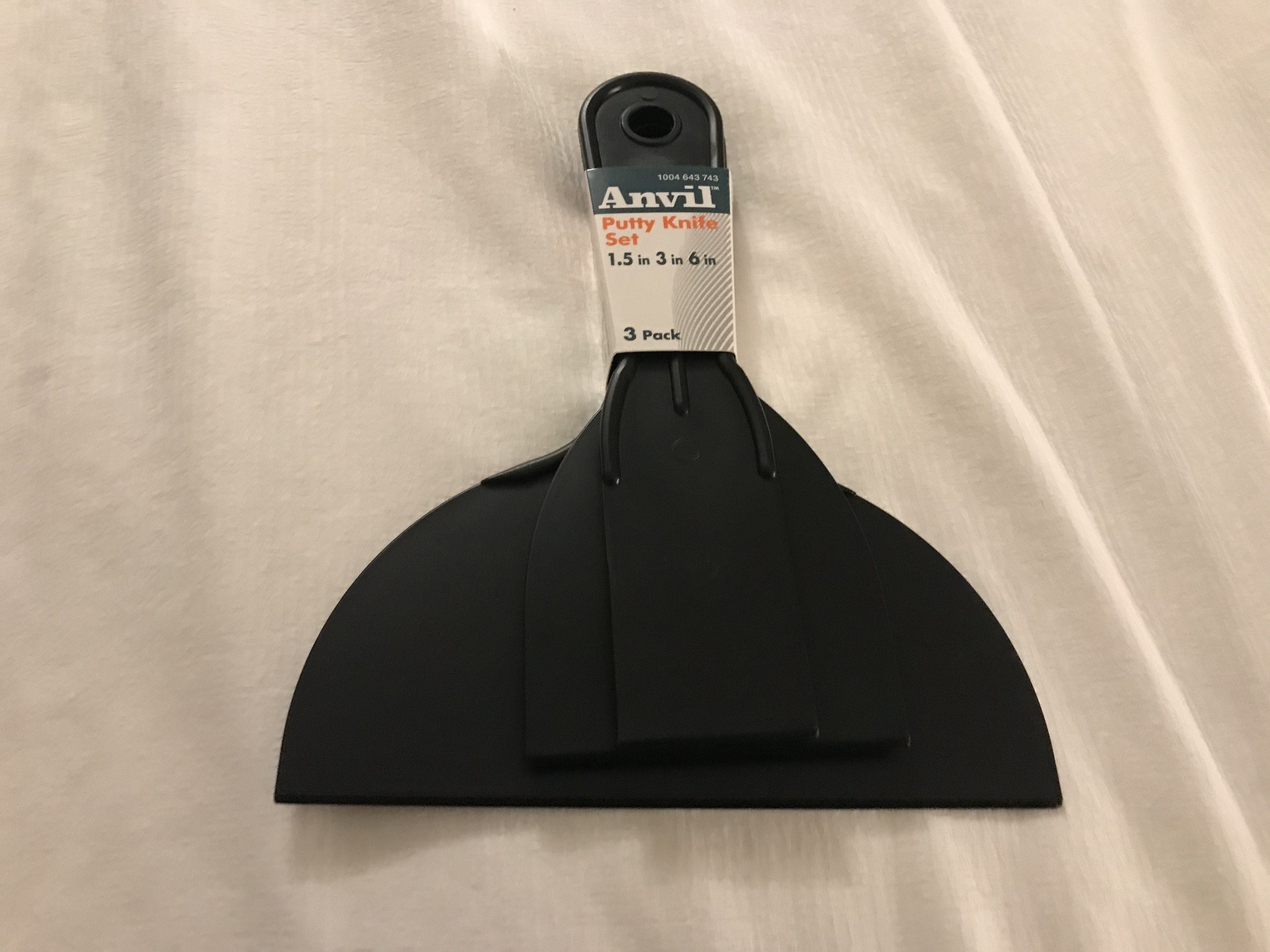 Once again, south Florida isn't exactly the best place to look foe blizzard supplies. No luck on a scraper, but I had a brainstorm and asked after plastic putty knives. Perfect. 3 pack too.