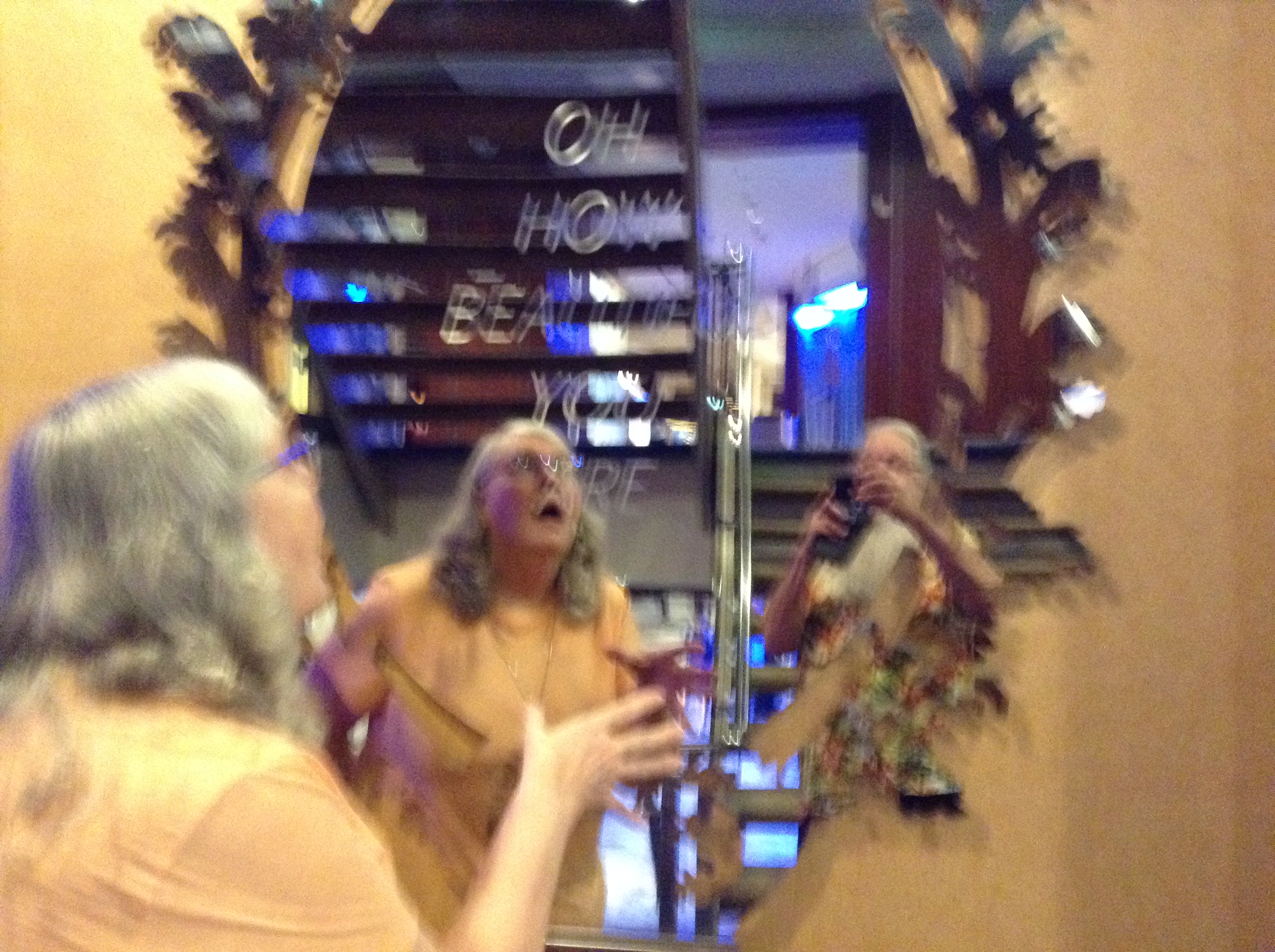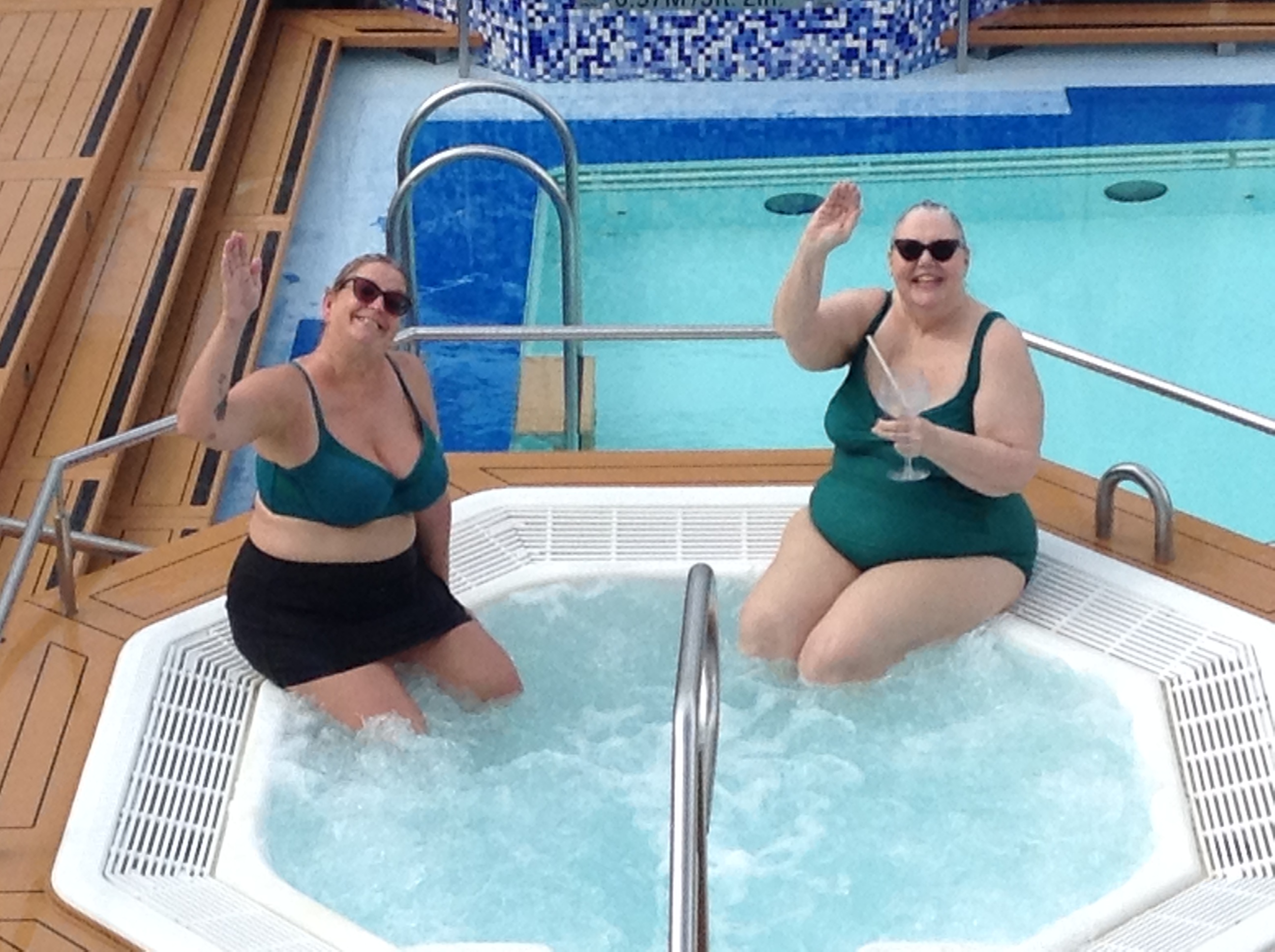 We enjoyed lunch at the Spa Cafe and since they only have a hand full of tables here we noticed two ladies searching for a seat. Our table was a four top so we invited them to join us. They are today's cruise ship locals, Sue and Judy. Sue has on a t-shirt that says "Woman with Altitude" . She lives at 9,000 ft above sea level. Damn near off of the grid. She's 83. Her long time friend Judy lives in Denver- a mile high. She's 81. We are at 12 ft. A random lady at the next table sez 0 ft. - Va. Beatcheey. Sue and Judy always get the hell out of Colorado for a couple of weeks each winter. Quite on their own. We had a jolly old time hanging out.