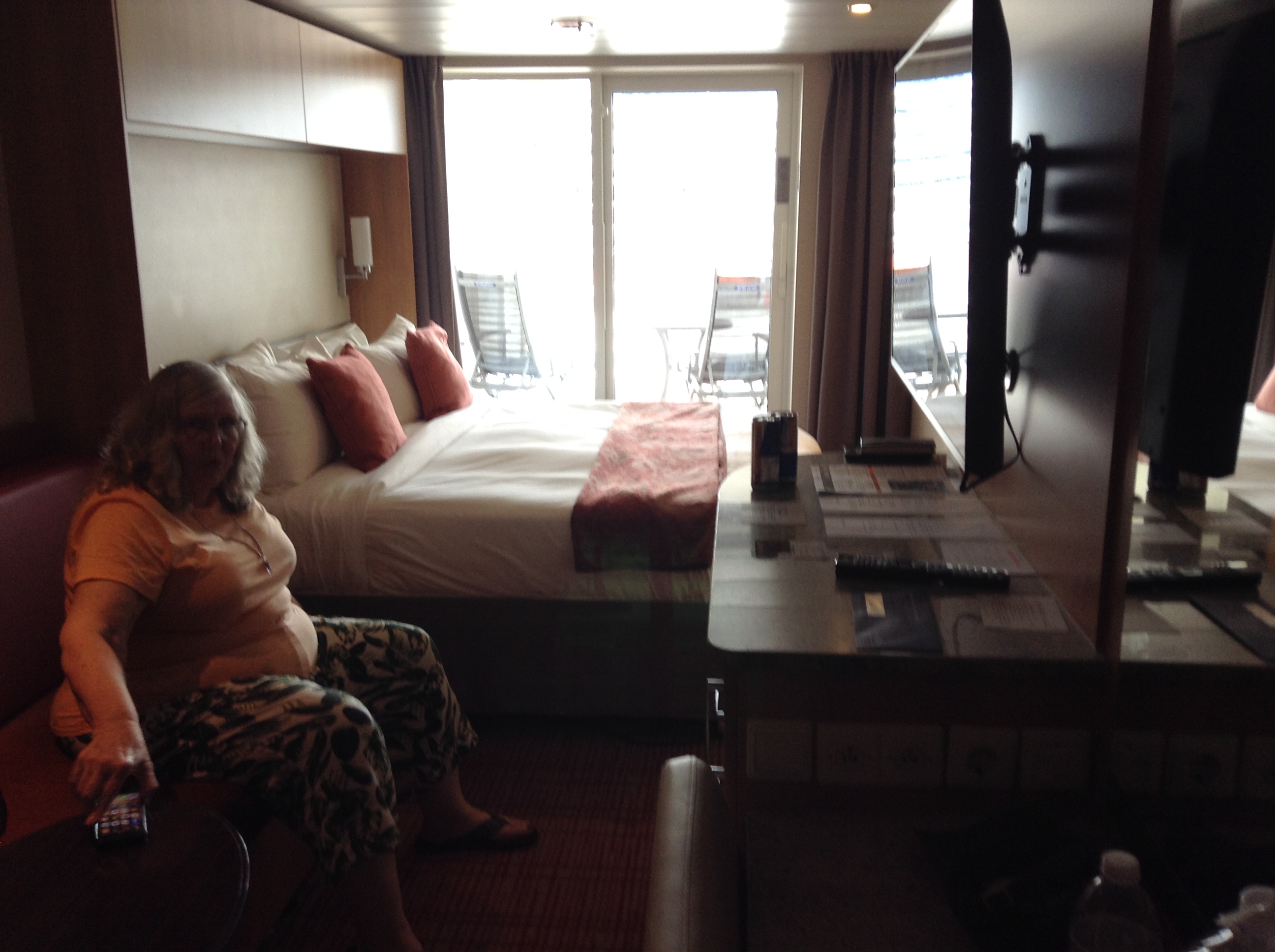 Seems to me it's always a struggle to get on the WiFi once aboard the ship. They did have a podium with a photo/wifi tech available. We bought one premium unleaded package and I get one free for being Sapphire, the uppity blue card. They hooked me up. Then we met Chu Chu bartending at the Passport. She had her hands full with a rowdy guest. Really lady? Chu Chu also worked at the Buffet in the evenings. These guys are everywhere. The nice lady DJ finally came over the intercom to announce that the rooms are ready. Cool.