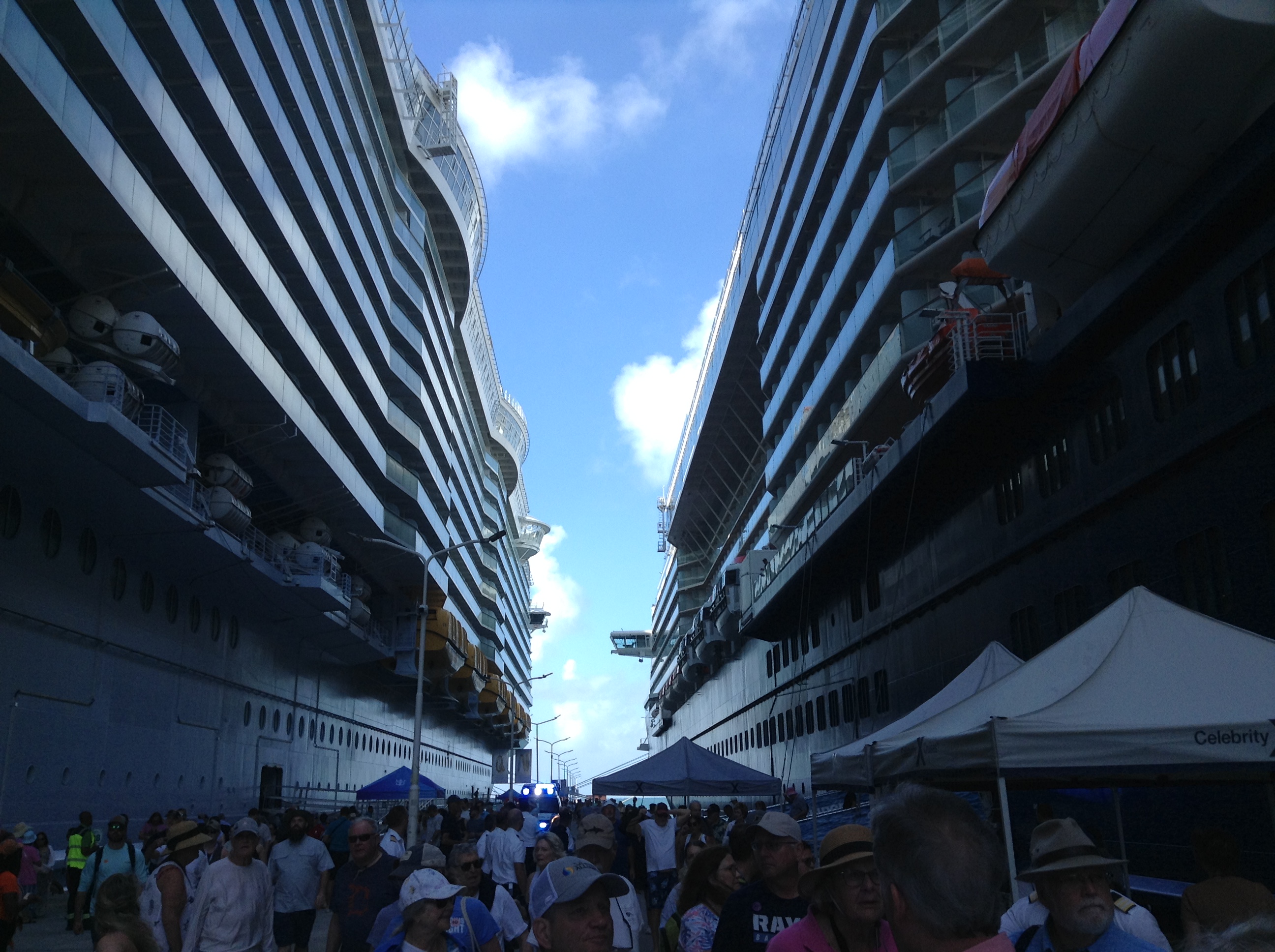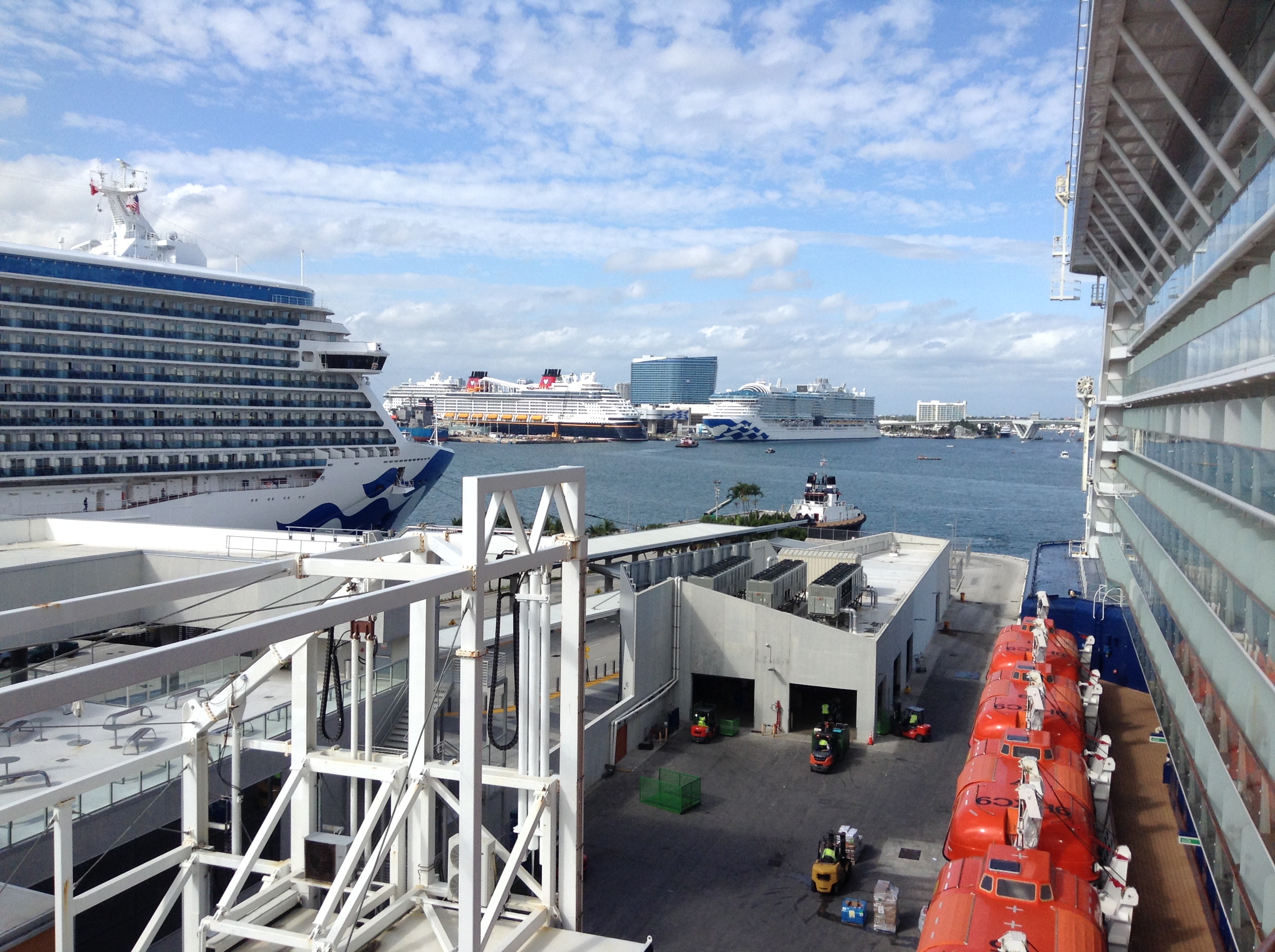 Hey Now! Yet another glorious day in southern FLA. Except for the fact that it's 47º! Brr. I hit DD for Coffee Elizabeth and we do our packing and whatnot. There's no major rush- although we are in a concierge cabin this trip so we have early boarding that's not until around 11 a.m. So we take our sweet time. The traffic headed south on I95 is basically non existent. Noice! We pull Middy into the Hertz rental return. The last trip upon the return of our rental we were personally escorted to our ship by a lovely Hertz employee of 35 years- Wes. Such an unexpected kindness. Could lightening strike twice?? I get out of the car and ask after wes. And there he is! We greet him and ask how his family is doing. And oh by the way how about a lift? This is doable except that our car hadn't been processed yet so we had to move everything to another car. That done we are on our way. Everything was looking good until I realized that I had left my phone in the dash of Midnight, Shit. the. bed. Wes is thoroughly nonplussed. He gets on the phone and starts barking orders while executing a textbook u turn. We blast back into the Cypress Garage and search Midnight to no avail. Wes takes off for the office. He's still trying to run down the dude who processed our car. Turns out the dude found my phone right away and turned it in. he just didn't bother to answer his phone. Wes shows up with my phone. We take off once again. In no time we are pulling into Terminal 25. Great job Wes! We lavish him with praise and greenbacks and promise not to forget anything next time. Thanks for the ride Wes!!