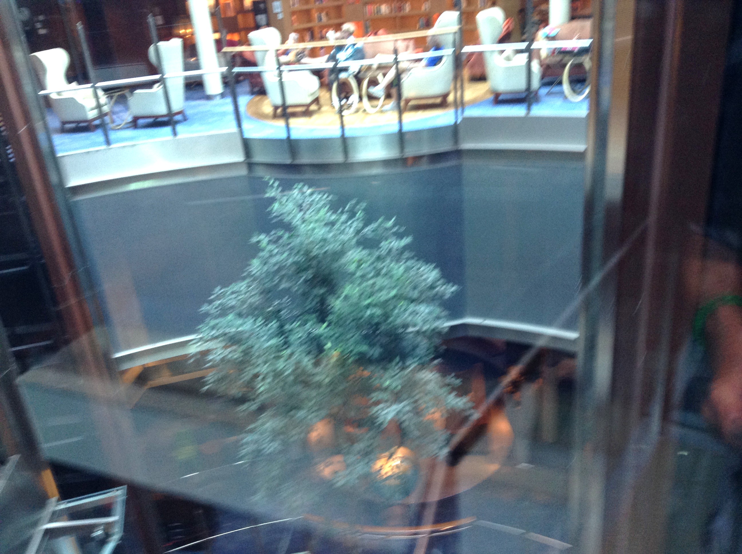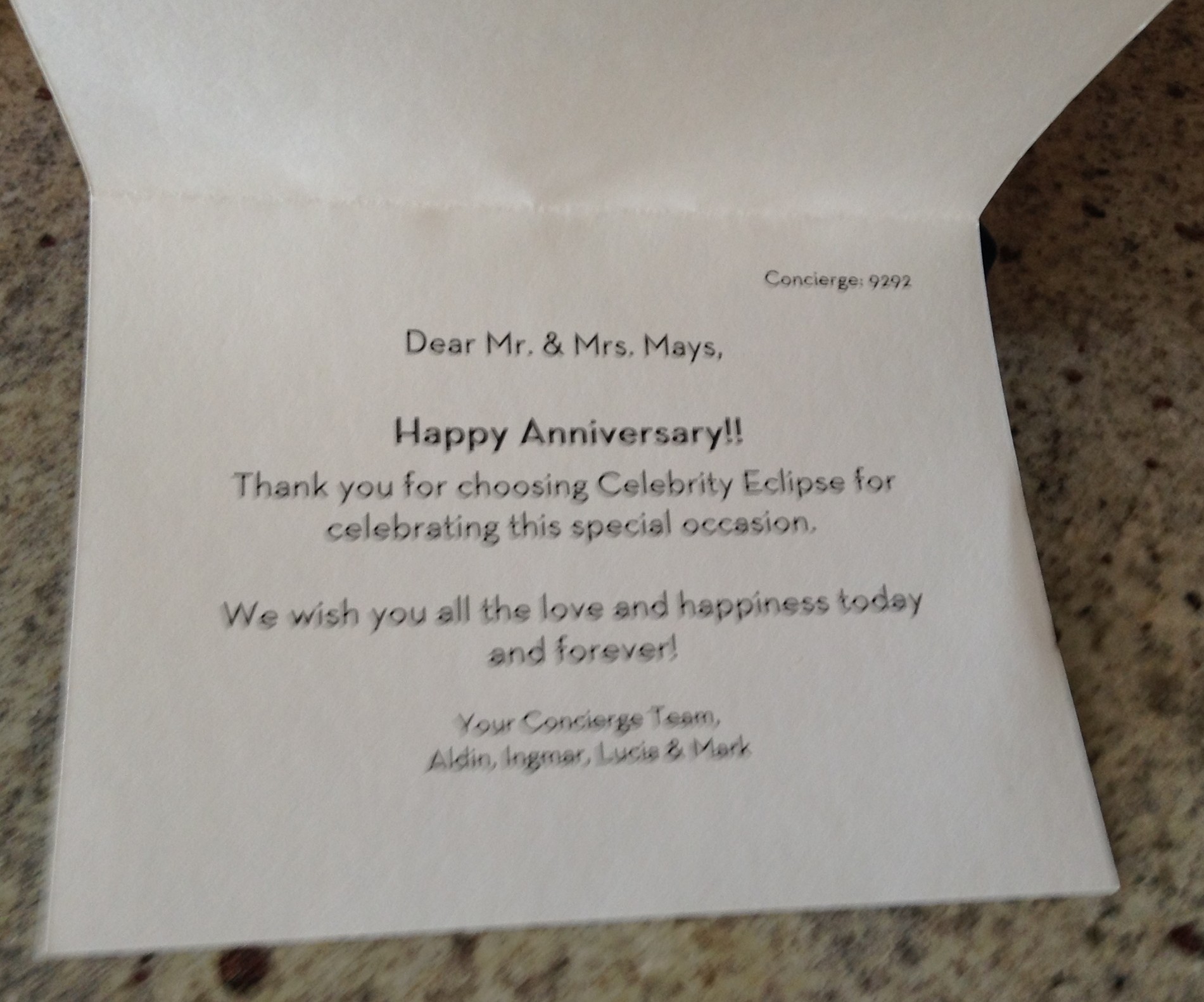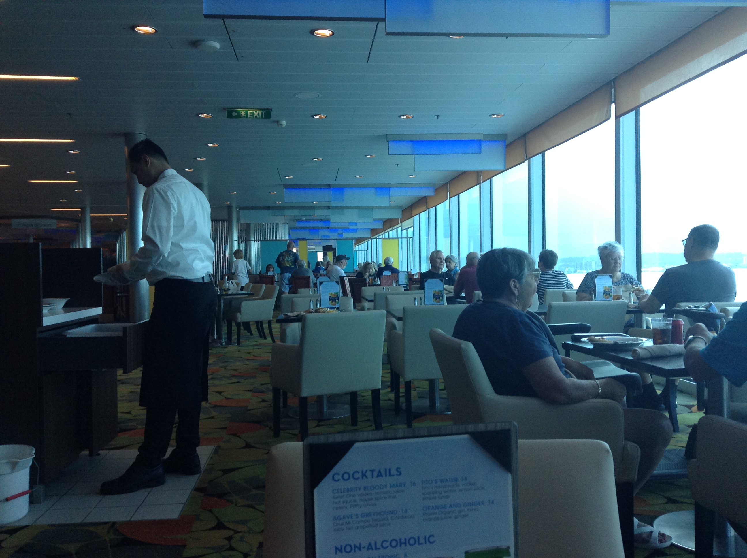 Welcome to the Celebrity Eclipse! We find our muster station and checked off that one and went to our cabin- 9292. We dropped our parcels and loaded the safe, got our sea pass cards and left. Nice to be able to get rid of carry on stuff right away. The rooms are usually ready around 1:30 or so. Never saw Johnny our attendant. Since we are in Concierge we get to have lunch in the fancy eating parlor, Moonlight Sonata. This used to be a perk for Prime Access too- but not anymore. But it is nice to be able to avoid the crowds upstairs at the buffet. We passed by El Bacon (Cafe al Bacio) and grabbed a small table in that strange middle wall in the cafe. I call it the fireplace because that's what it's always looked like to me. The manager came by and asked if we had been waited on. We said no, and he took our order. He apologized for the service.