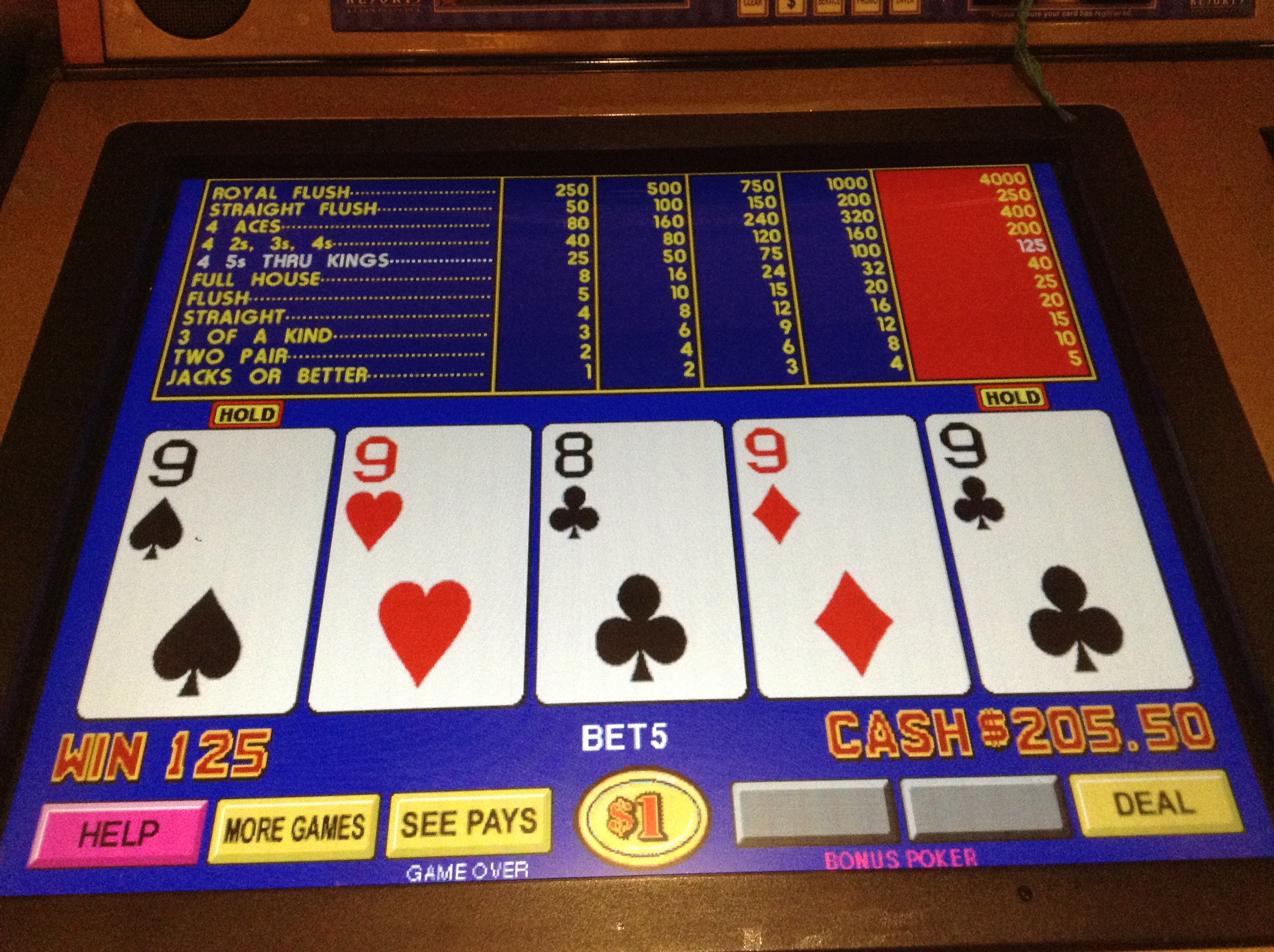 I loves me some Top Dollar. Next up, Triple Diamond Deluxe and Triple Cash Ø. Then 5x/10x QH and Triple 7's Progressive Ø. We always seem to end up on those VP slants between the food court and the self park. 8/5 BP in .25/.50/1. You get very little in comps though. We hunker down and set about our tasks. We are up and down when I hear thumpity......thumpity......thumpity. What? I couldn't figure ou where it was coming from. Then a few minutes later there it was again. Finally realized it was a garbage cart with a gimpy wheel. Back and forth , every few minutes. Every time we played there. And those damned 5 reel penny slots. "HIT THE BUTTON!" People just don't realize you can just hit the spin button and stop that incessant ringing. They're PENNIES! Where was I? Oh, neither of us had a single 4OAK in 2 solid hours of play. Sucked. Sweet Ti and I take a break, she takes a nappy while I do something completely different. Hollyrock Hills and some Double Top Dollar Ø. Margaritaville Uprights. I started at .50 and parleyed to $1.
